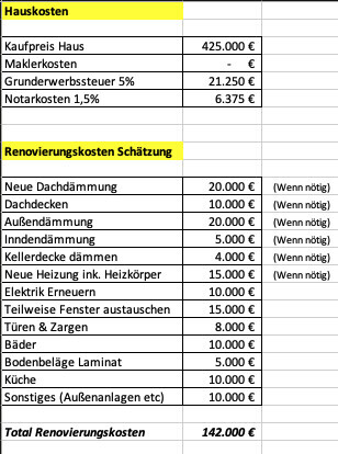 Wenn eine neue Elektrik rein kommt, dann müssen die Wände wieder zu gemacht werden und die ganzen anderen Malerarbeiten kommen noch. Vielleicht eine neue Haustüre für 5.000€, vielleicht doch alle Fenster tauschen (warum überhaupt nur teilweise?), vielleicht noch Luxusausgaben wie beispielsweise einen neuen Eingangsweg, neuer Kaminofen, alte stinkinge Holzdecken raus, schönere Fliesen etc.