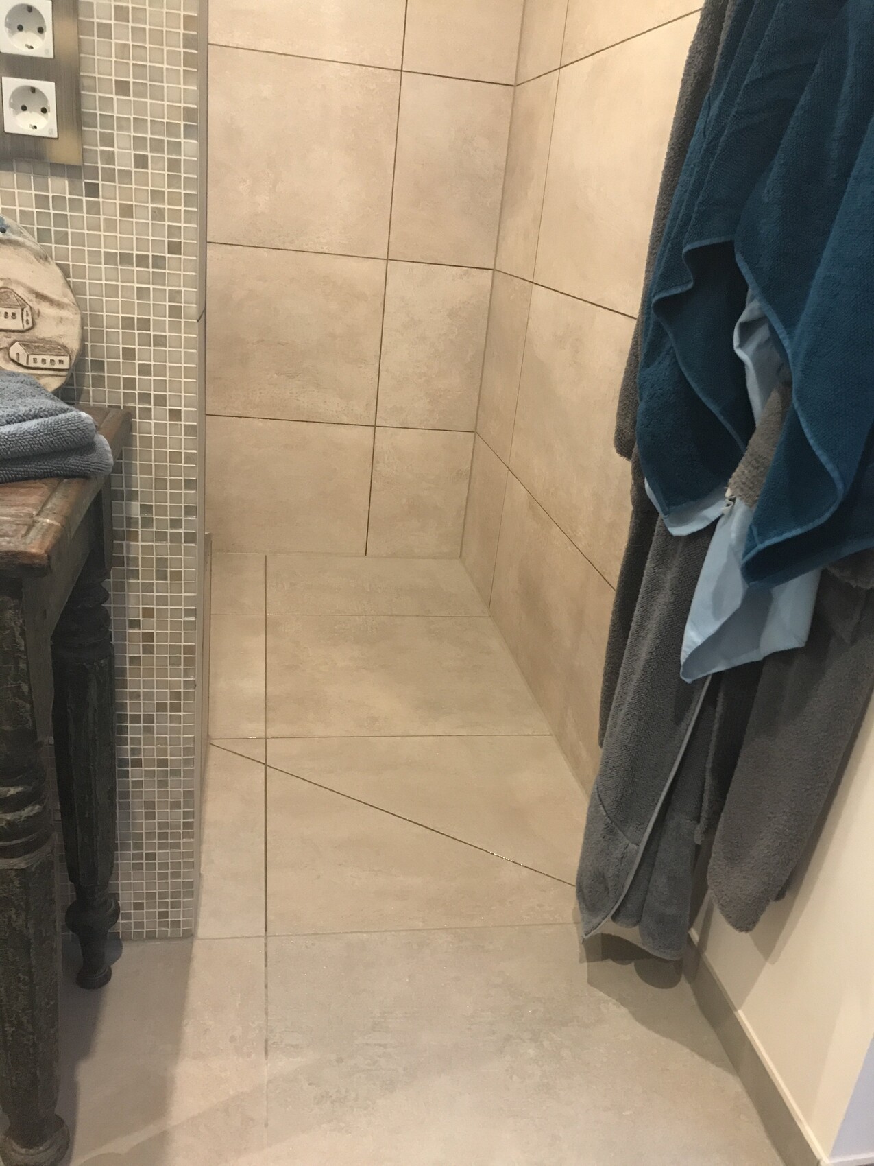 hampshire03.01.20 09:02Hab gerade mal Praxistest gemacht. Das Wasser spritzt bei uns bis neben die hängenden Handtücher, Bodenfliese hat 60x60 Die wandseitige ist etwas gekürzt. Der gefloeste Duschsitz hält nicht nennenswert zurück wenn man die Deckendusxhe aud sich regnen lässt. Sind also rund 180 cm. Die geteilte Fliese hat bereits Gefälle. Mit dem Wischer nachziehen gehört zum Duschen dazu.