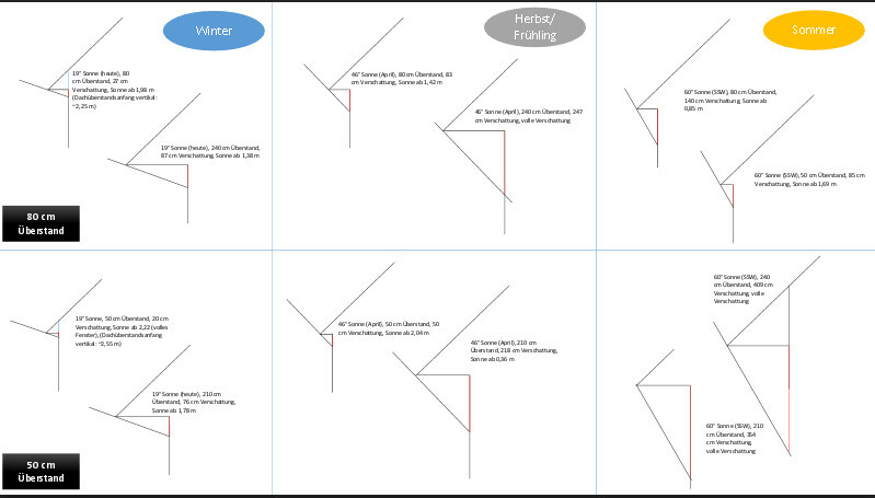 Beim Sommer muss eigentlich die eine Darstellung nach oben und eine anderen nach unten. Es ging damals bei uns darum, ob wir 50 oder 80 cm Dachüberstand machen und beim Zurückgezogenen Gebäudeteil damit 2,1 m oder 2,4 m. Wir haben uns letztlich für den geringeren Dachüberstand entschieden, damit wir am Esstisch in Winter und Frühjahr etwas mehr Sonne haben. Im Sommer sind beide Überstände genug für eine volle Verschattung.