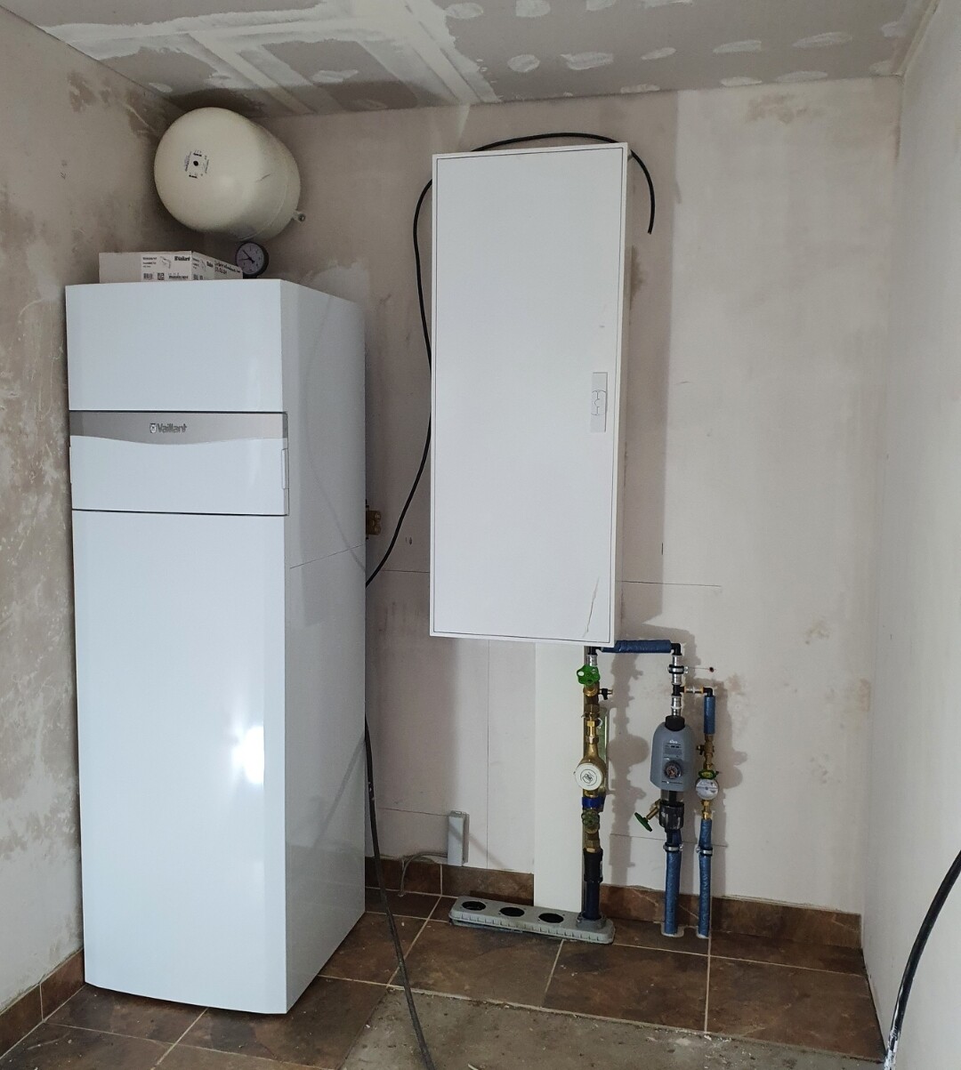Der Technikraum für die grosse Technik ist etwas über 3 qm, ein Innenraum ohne Fenster. Der Warmwassertank, Kontrollierte-Wohnraumlüftung, Anschluss Wärmepumpe und Filter für das Regenwasser für die Waschmaschine. Waschmaschine steht auch noch in den 3 qm + Ivar Stauraumregal.