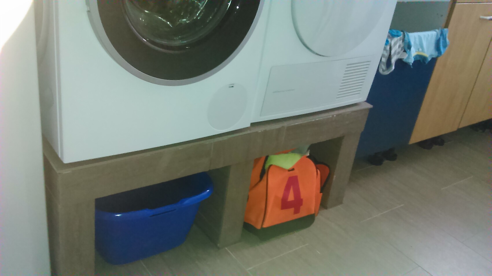 Beim reinlegen muss man sich natürlich trotzdem Bücken, aber irgendwie anders. Ich sortiere immer die Wäsche eh auf dem Boden und dann wird sie vom Boden natürlich hoch in die Maschine gelegt. Aber es ist nicht genauso unbequem wie wenn man sie so tief rein quetschen muss. Das hatten wir ja vorher. Und beim rausholen habe ich einen Hocker den ich drunter stelle und da darauf kommt der Korb. Dann ist es super einfach die schwere, nasse Wäsche rein zu legen und den Korb hoch zunehmen. Oder die Nasse Wäsche wandert sofort nach rechts in den TK.