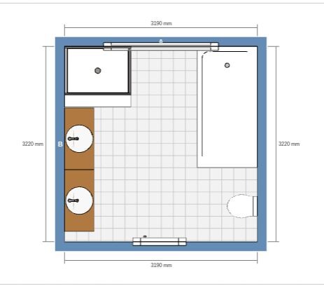 Bad: schiebe die Tür mittig, dahinter zB die Toilette, lass das T weg und mach nur eine Mauer, an der Dusche und Waschtisch liegen.