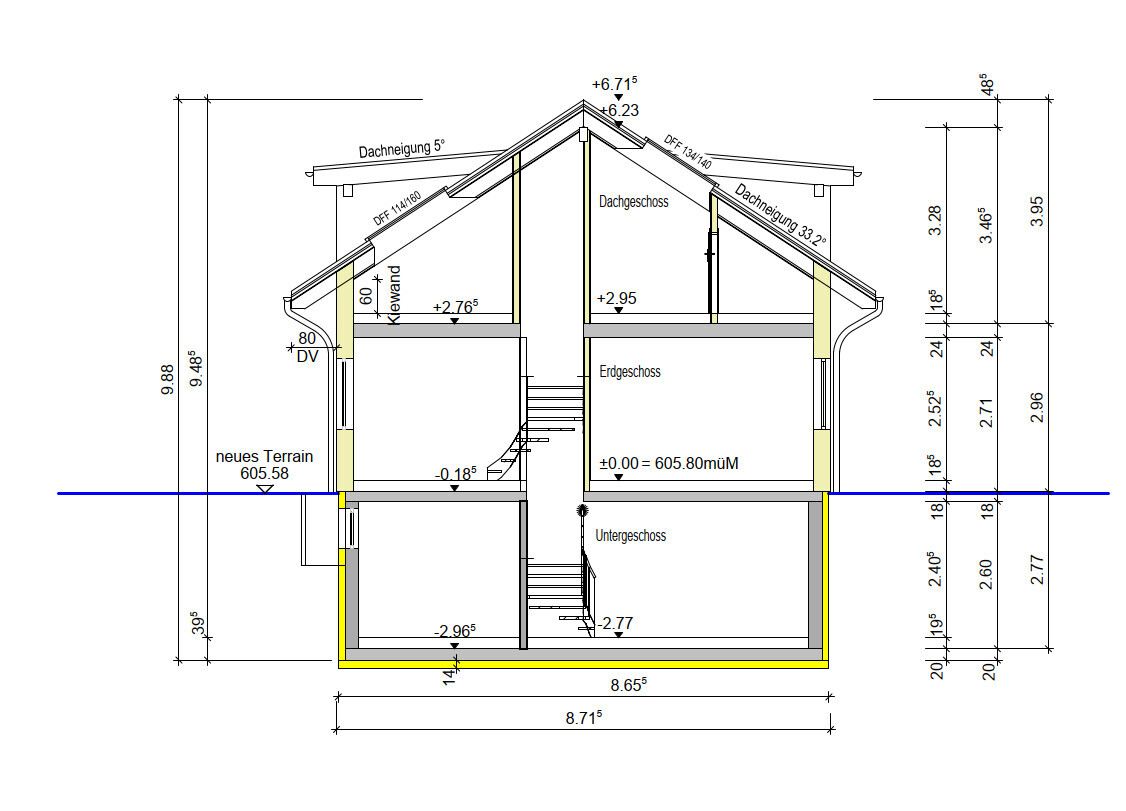 Gibt es auch einen Schnitt? Ich hatte ja schon mal nach der Deckenhöhe gefragt. Aus dem Keller wird es mit der Kopfhöhe der Treppe noch enger. Ich vermute mal mit der DIN hätte man da schon Probleme. In CH vermutlich eher nur die Gefahr das jemand über 1,8 m sich den Kopf einhaut.