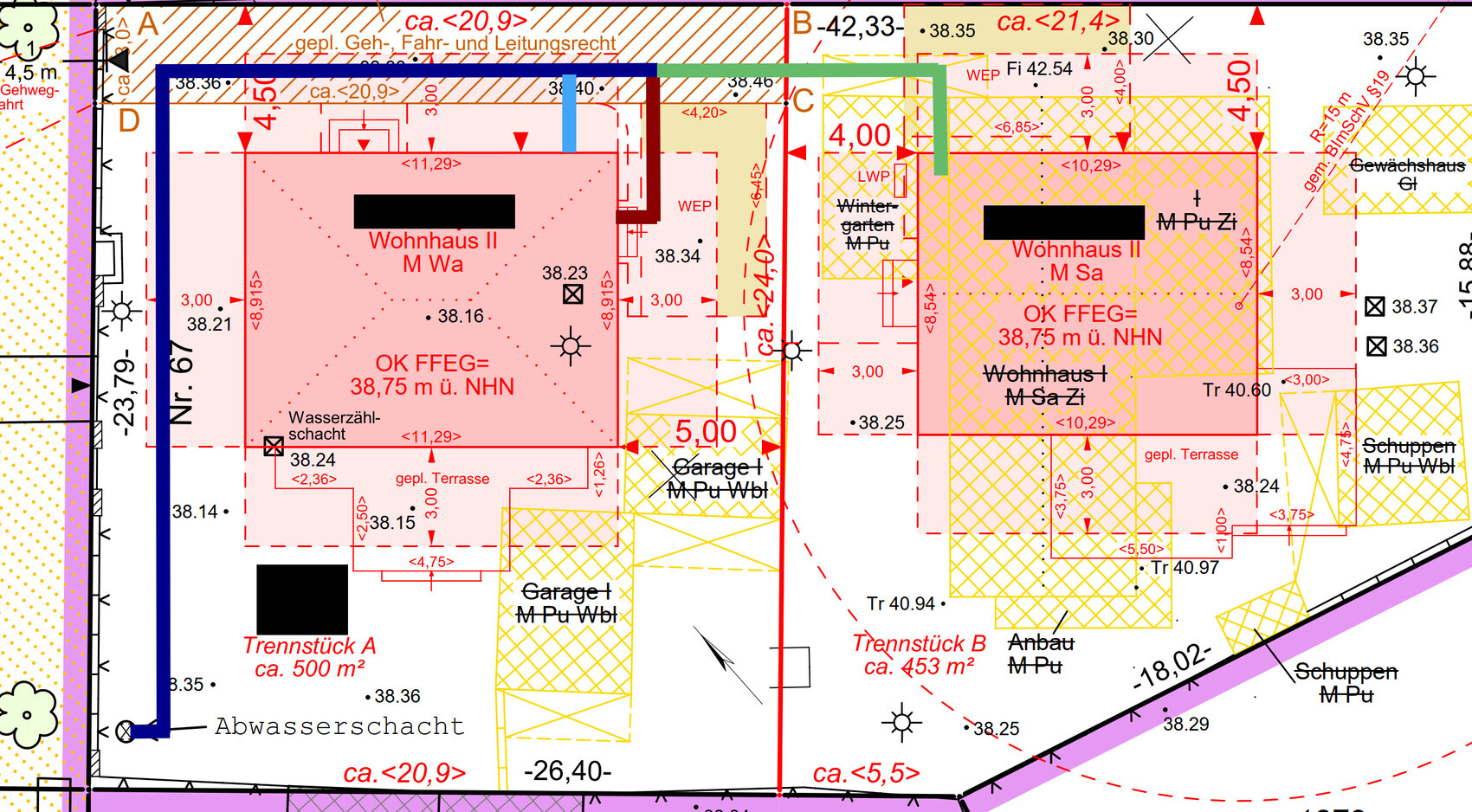 Grün: Von mir angedachte Abwasserleitung des Nachbarn (nur zur Erinnerung dass da noch was kommt, sein Hauswirtschaftsraum ist zwar in der Ecke, aber für sein Vorhaben liegt mir kein Planungsentwurf seitens der Baufirma vor).