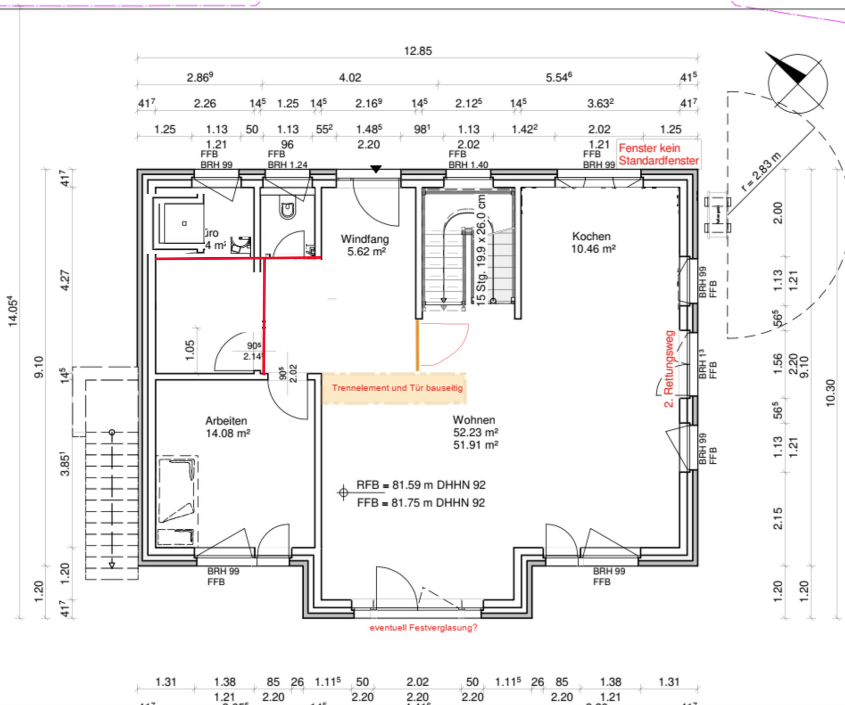 Deine Windfangidee ist ein perpetuummobile um den Dreck auch möglichst weit ins Haus zu tragen: ein Windfang funktioniert am besten "quer" vor dem Flur. Reinkommen, grosse Fußmatte, links oder rechts der Tür Wandplatz für Schuhe, Garderobe, Sitzhocker. Schuhe aus, durch die Tür zur Diele. Mit Platz für den Hund zum Pfoten abtrocknen reicht es wenn der Windfang 160 tief ist und eher "breit/quer" neben der Haustür. Ein Kaminschlot ist die Autobahn für Wind und Dreck. Eigentlich ein Windbeschleuniger statt ein Windfang.