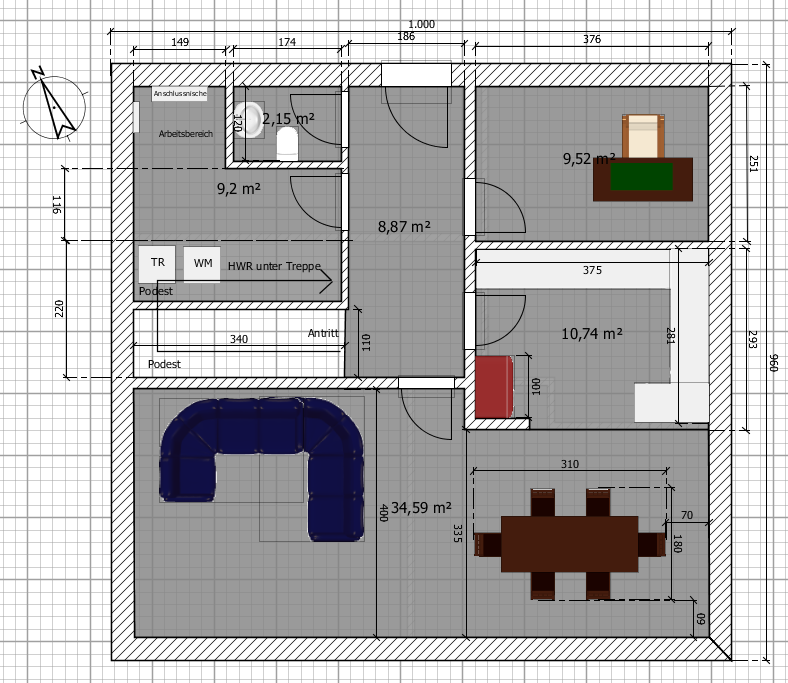 Unsere aktuelle Idee ist, den Platz unter der Treppe dem Hauswirtschaftsraum zuzuschlagen. Hier ein Beispiel, wie wir uns das in etwa denken: