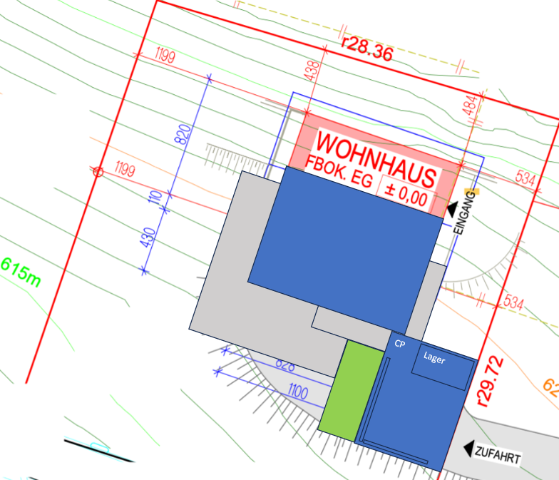Hier mal noch der Lageplan. Das Haus wandert in eine etwas flachere Region.