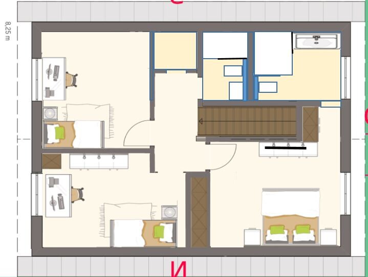Hab diesen Nachmittag wieder herum geschoben, bekomme das aber nicht sinnvoller gelöstes geht eben nicht, Platzbedarf von 3,6 Meter in 2,5 Meter reinzuquetschen. Das gilt aber in vielen Bereichen. Ich würde freiwillig zu zweit das EG nicht bewohnen wollen, auch wenn es das DG noch gibt.Pockrandt schrieb: