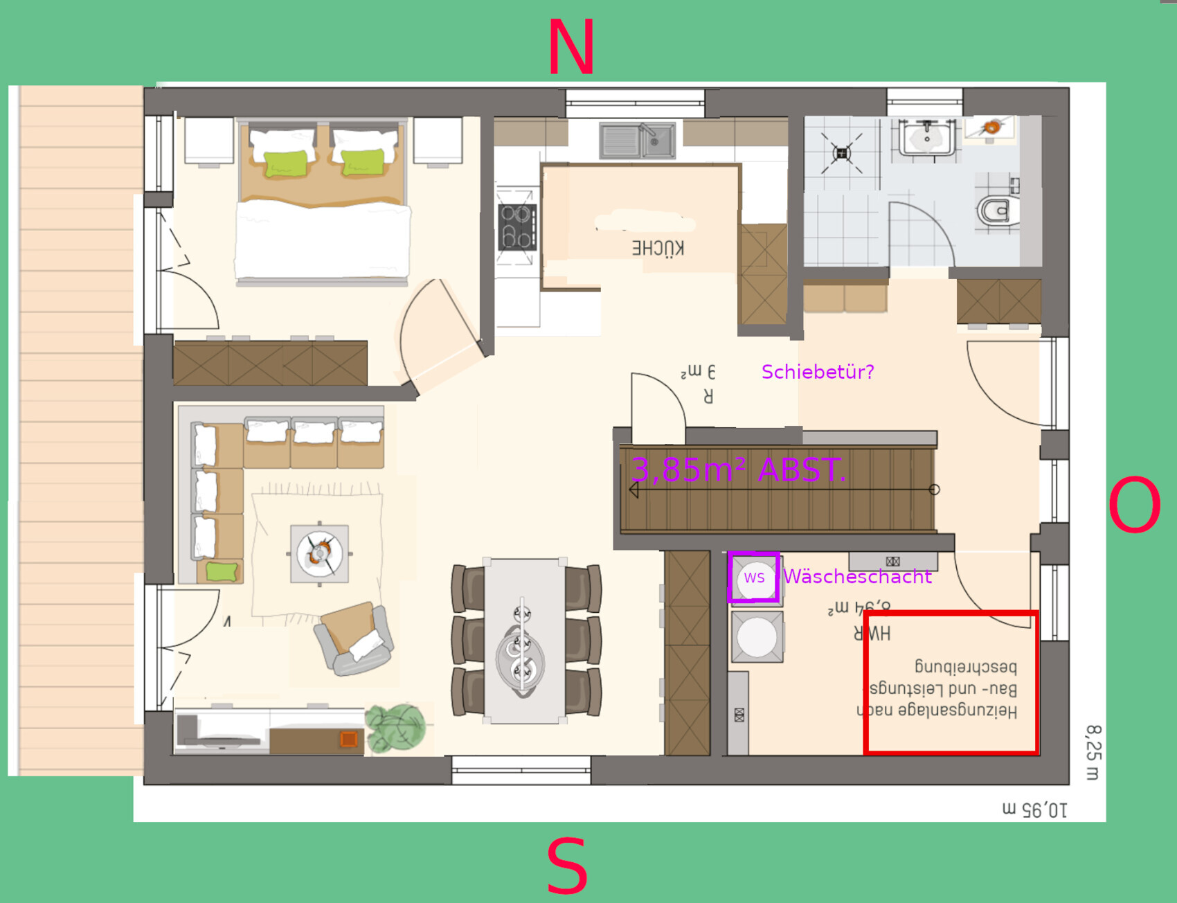 Abgesteckt(Rosa) habe ich jetzt 10m von der Straße ein 9x11m Haus (mit weiß versucht einzuzeichnen). Grenze schwarz am rechten Rand, links geht es noch zur Laube dann Elternbesitz.