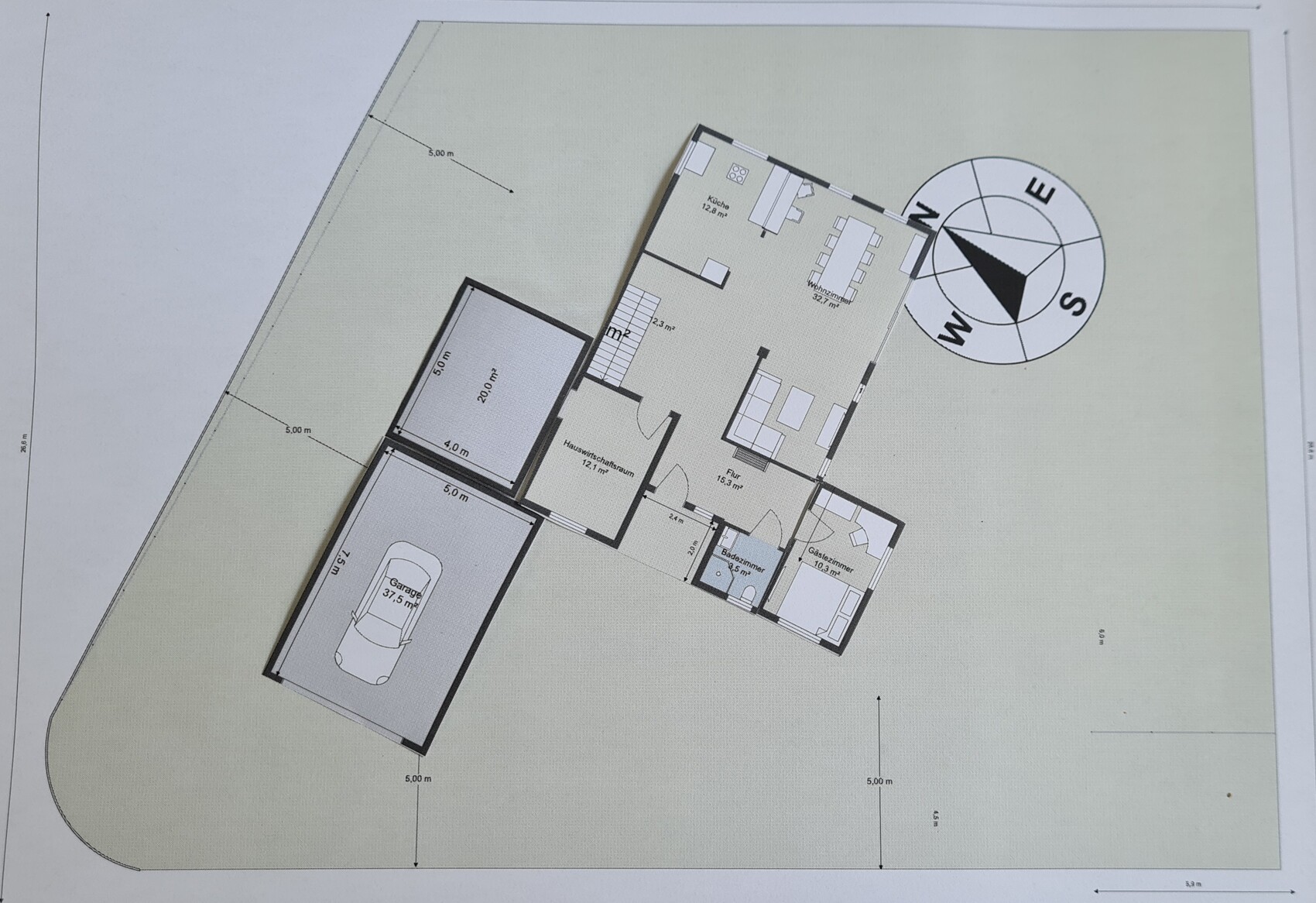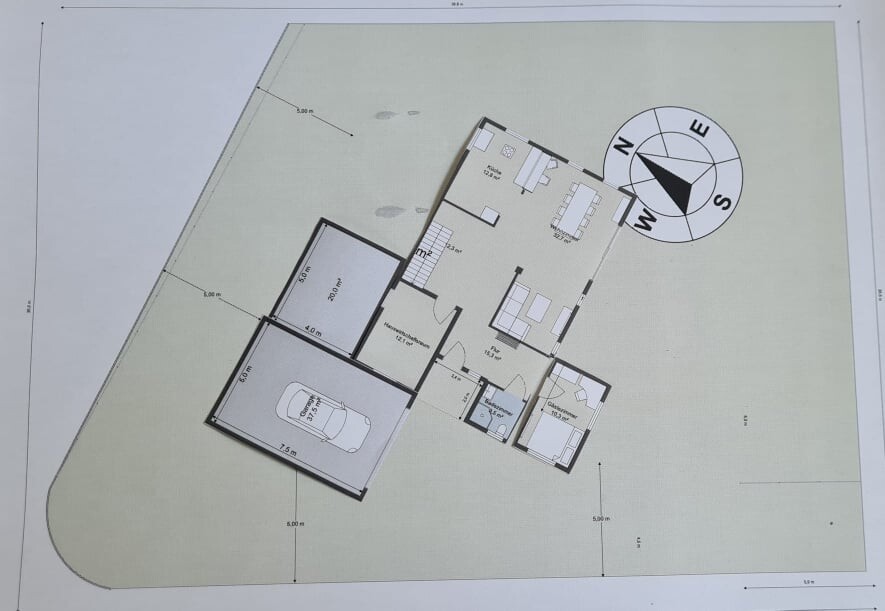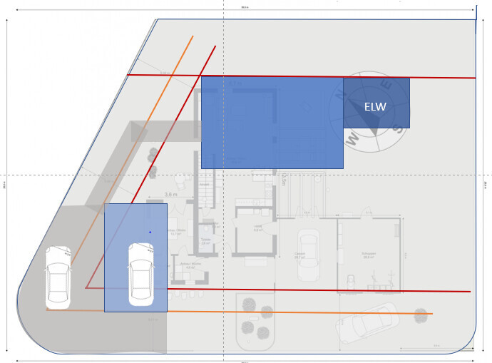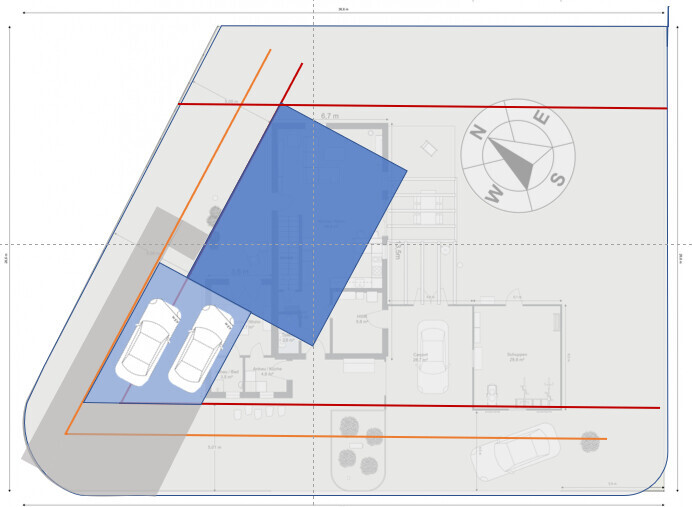 sysrun80Wie @ypg schon angedeutet hatte, man malt sich das auf, zieht die 3 und 5-Meter Linien und dann schaut man wie es am besten passt. Hier Ideen mit möglichst kurzen Wegen und einer schönen Südausrichtung des Hauses (1: größere Grundfläche, Einliegerwohnung bzw. Büro integriert, 2: mit Einliegerwohnung). Wegen den Abstandsflächen würde ich wohl ein Auto nur auf einen Stellplatz stellen und lieber ne Standheizung einbauen 😉