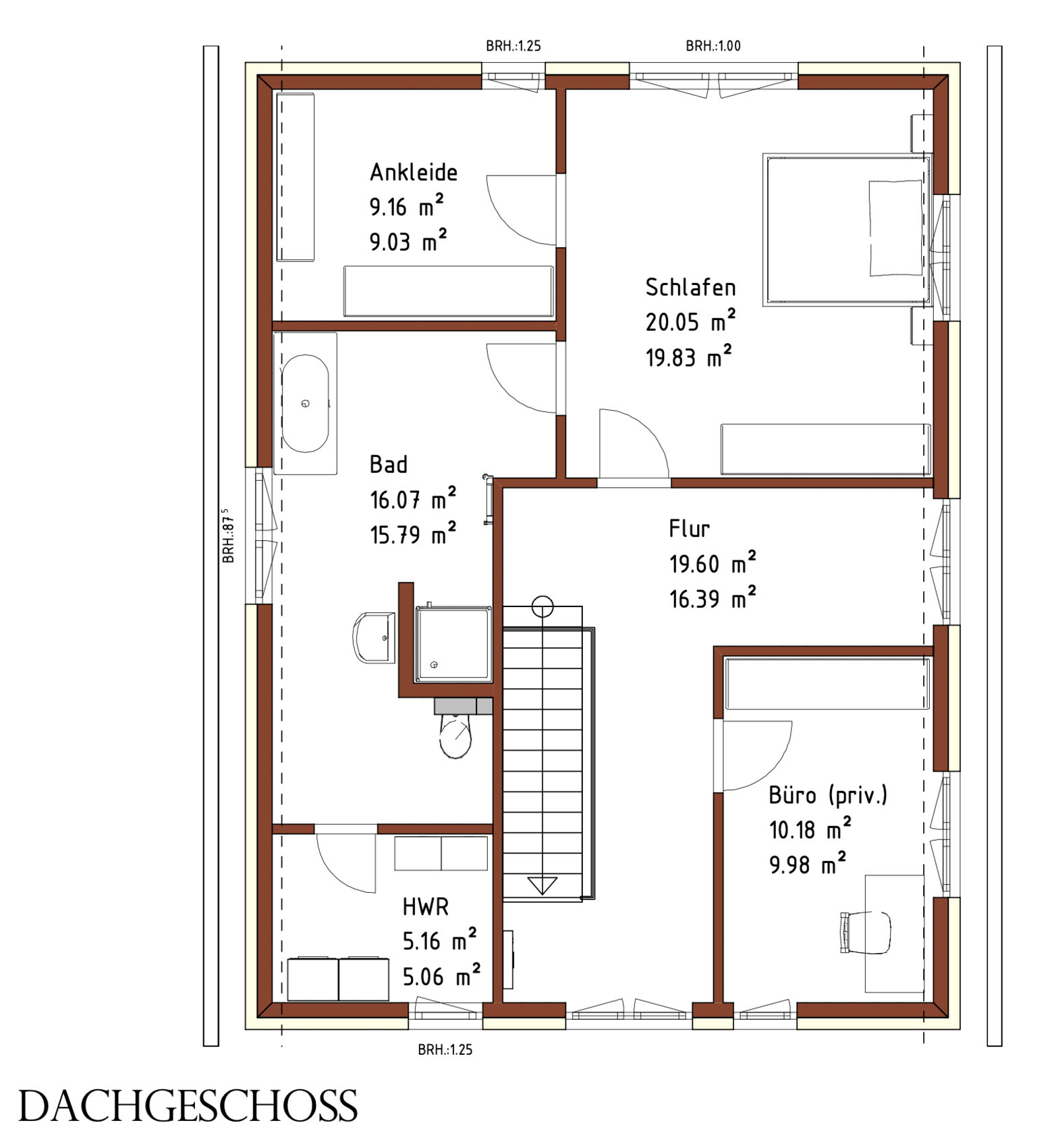 Ich würde vermutlich ein ganz normales Haus mit 1 Büro und 1 Büro/Gästezimmer planen. Im EG dann ein Duschbad für den Gast. Evtl könnte man auch das Gästezimmer ins EG setzen und dafür die Technik hochnehmen. Wenns um den Wiederverkauf geht, wäre es allerdings besser, oben die 2 Büros/Gästezimmer alias Kinderzimmer zu haben.