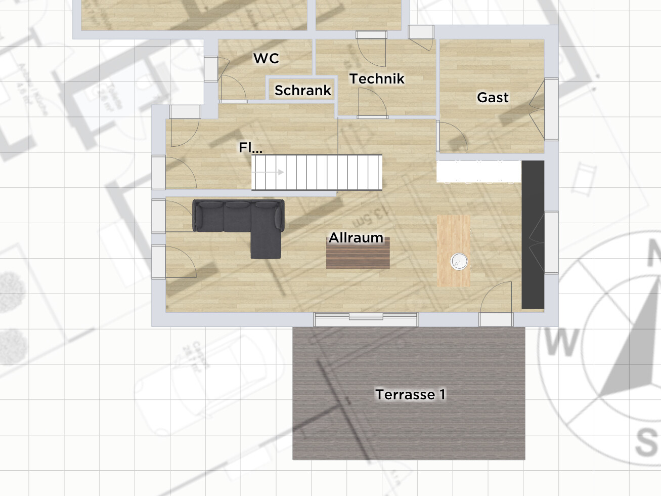 Oh, sorry - Kam wohl falsch rüber: Technik, Gast-WC sind nach Norden und zu den "grossen Häusern" ausgerichtet. Wohnzimmer, Gast und Schlafzimmer im OG sind in den schönen Garten nach Süden 🙂Nochmal,Technik und Gast sind zum Südwest/West ausgerichtet. Hauswirtschaftsraum im OG auch. Und die Garage steht auch am besten Platz.