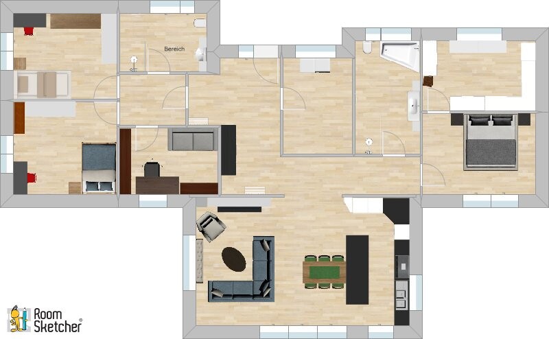 Die qm-Angabe für Kochen/Wohnen/Essen beinhaltet übrigens den Flur und ist eigentlich nur rund 43 qm. D. h. rund 23 qm Flur.