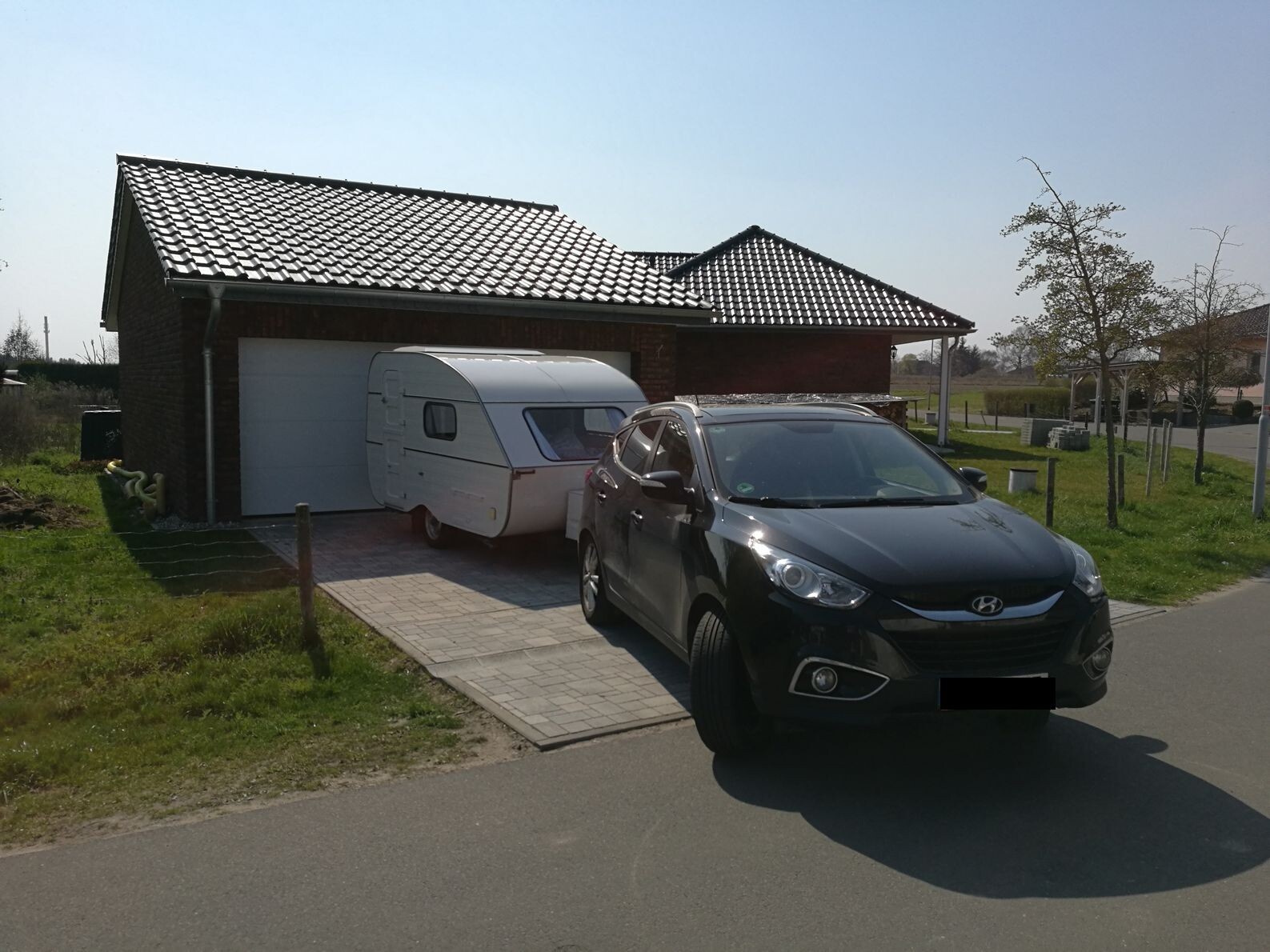 -Die verklinkerte Garage hat ein Vermögen gekostet (schließlich ist sie quasi ein Wohnhaus ohne Innenausbau), aber ich bin froh, dass wir es gleich so gemacht haben. Es findet zwei Autos, ein Motorrad und eine kleine Werkstatt Platz darin. Für den Rest werden wir wohl noch den ein oder anderen Schuppen errichten müssen. Negativ angemerkt wurde damals von euch die Traufe auf der Garagentorseite. Möglicherweise würde es noch besser aussehen, das Dach um 90° zu drehen, aber ich finde es sieht auch so vernünftig aus. Die Garage passt mit ihrem Dach ins Gesamtensemble. Abgesehen davon rückt die Nutzung des Garagendaches (Süd-Ausrichtung) mit Photovoltaik (Speicher, Elektroauto, Erdwärmepumpe, usw.) immer näher, sodass irgendwann auch der angedachte Nutzen erfüllt wird.