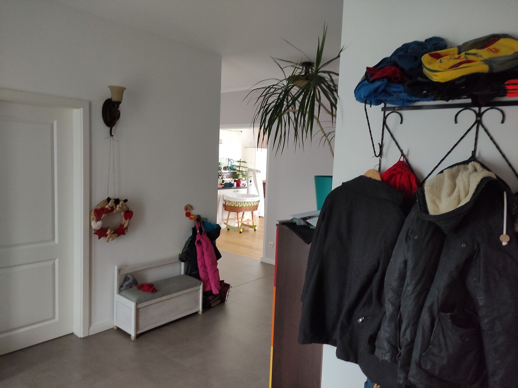 -Eure zahlreichen Kommentare hinsichtlich ausreichend Platz im Flur wurden berücksichtigt. Aktuell ist der Flur noch nicht mit Gaderobenschränken ausgestattet. Behelfsmäßig wurden ein paar Stellen für Schuhe und Jacken geschaffen. Grundsätzlich ist aber so viel Platz vorhanden, dass noch einige Meter Schrank passen würden, zusätzlich zum Kinderwagen/Fahrradanhänger und Kinderbank.