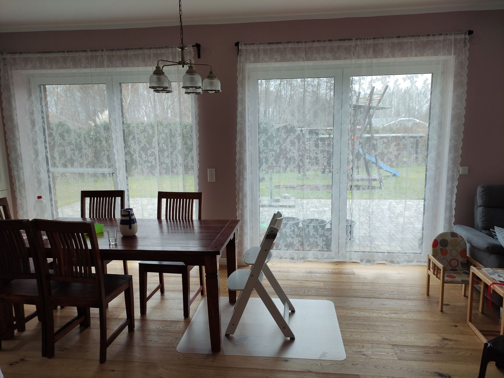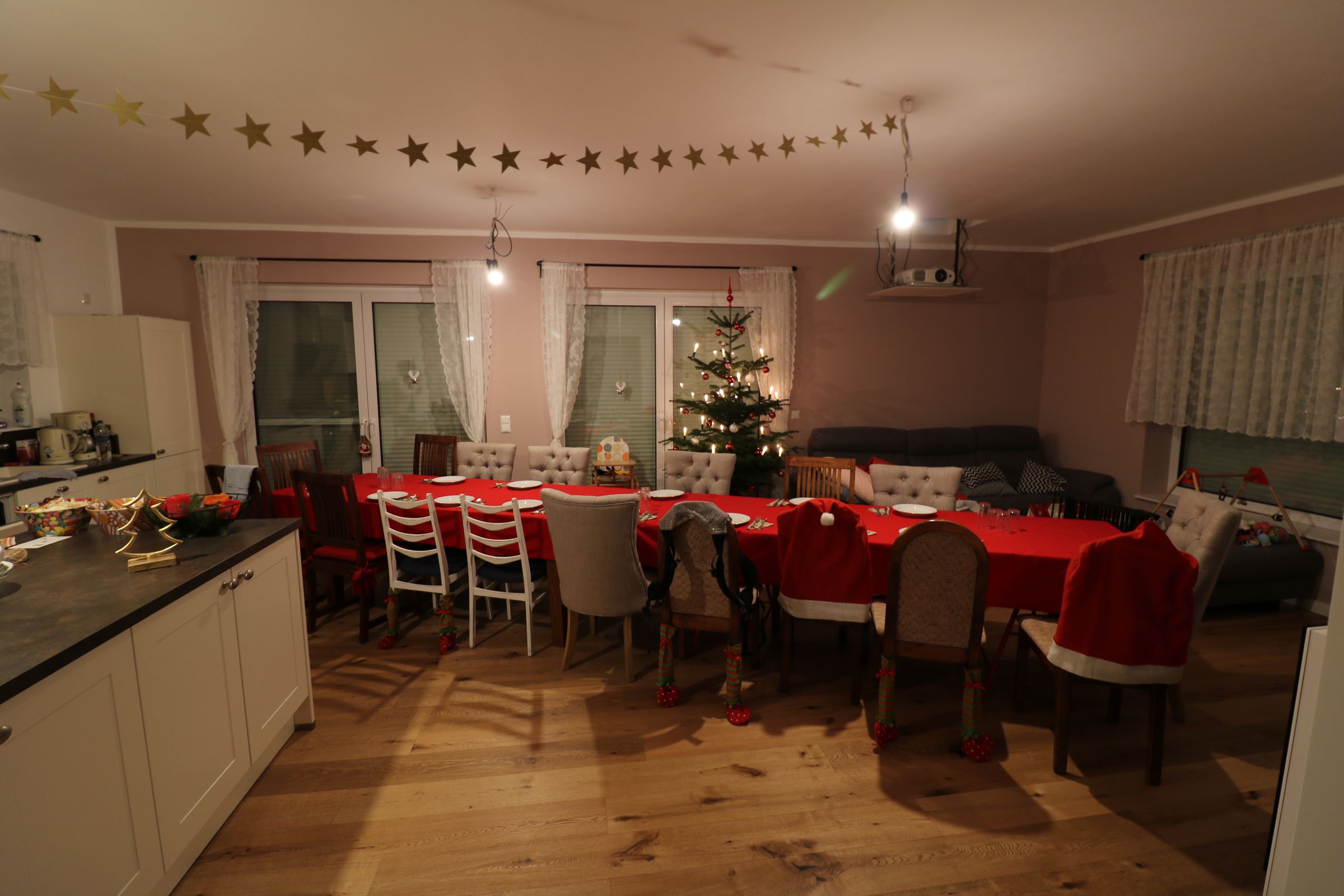 -Das Wohnzimmer inkl. Küche ist unser absoluter Lebensmittelpunkt. Das rustikale Eichenparkett und die großzügigen Fensterfronten machen den Raum extrem wohnlich. Aufgrund der Kinder verbringen wir die meiste Zeit auf dem Fußboden und bei entsprechender Jahreszeit mit brennendem Kamin. Die meiste Zeit ist das Wohnzimmer also eine große Spielelandschaft, was sich ändern wird, wenn die Kinder groß sind. Die offene Küche gefällt uns auch gut. Die ursprünglich geplante Insel wurde an die Wand geschoben und somit zu einer Halbinsel. Die meiste Zeit wird dort irgendwelcher Kram abgelegt, sodass man erstmal eine Aufräumaktion starten muss bevor man dort Küchenarbeiten durchführen kann. Durch die Verschiebung der Insel ist der frei verfügbare Raum wesentlich größer geworden, sodass wir mit dem Esstisch freier in der Positionierung und Ausrichtung sind. Auch unsere lange Tafel für Familienfeiern ist umsetzbar. Dennoch muss ich eingestehen, dass es dem Raum gut getan hätte, ihn etwas zu vergrößern, insbesondere (wie von euch vorgeschlagen) in der Breite. Man hätte einfach noch mehr Einrichtungsmöglichkeiten gehabt.