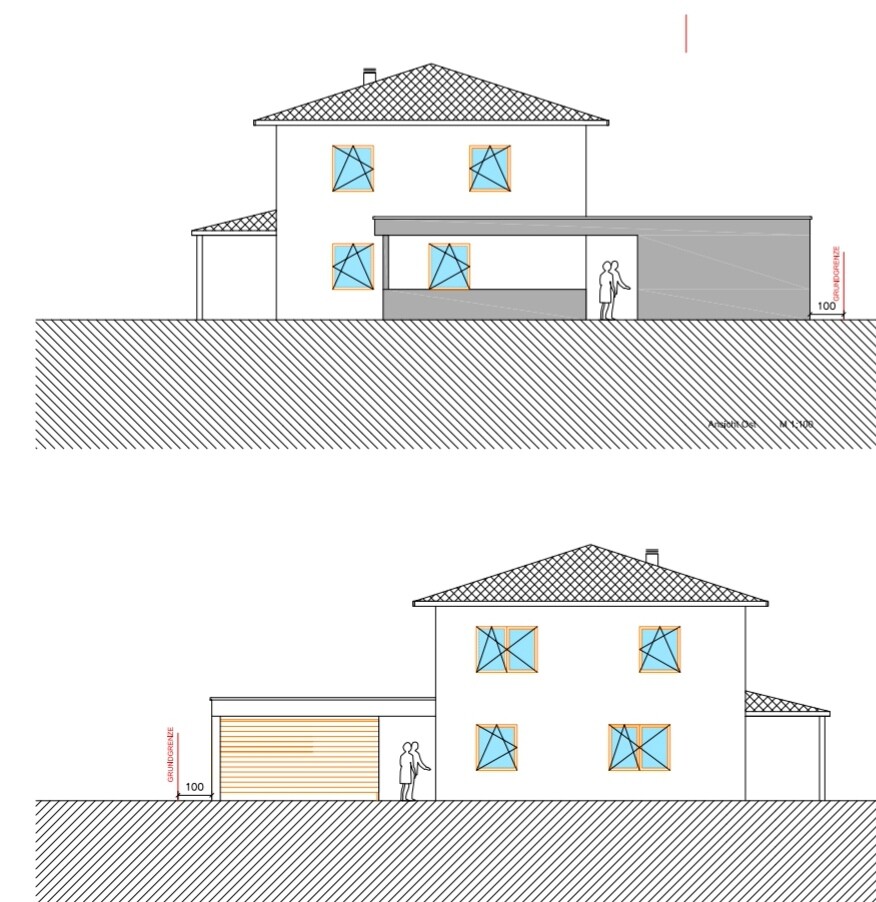 Eine Schrankzeile, ein Sideboard, eine Insel und eine Eckbankgruppe: abgesehen von der Erdgeschoßlage sieht das für mich wie ein Pausenraum mit Teeküche aus (für einen Speiseraum einer Seniorenheim-Wohngruppe wäre die Bestuhlung anders und mit mehr Rollstuhlwendekreis, aber das Ambiente in der Grundnote ähnlich). Da erwarte ich, daß gleich Stromberg hereinkommt und einen dämlichen Witz über Ernie oder Erika macht. Für eine fertig geplante Einfamilien-Vollküche, der bloß noch das Feintuning der Fenster fehlen würde, hätte ich das im Leben nicht gehalten.