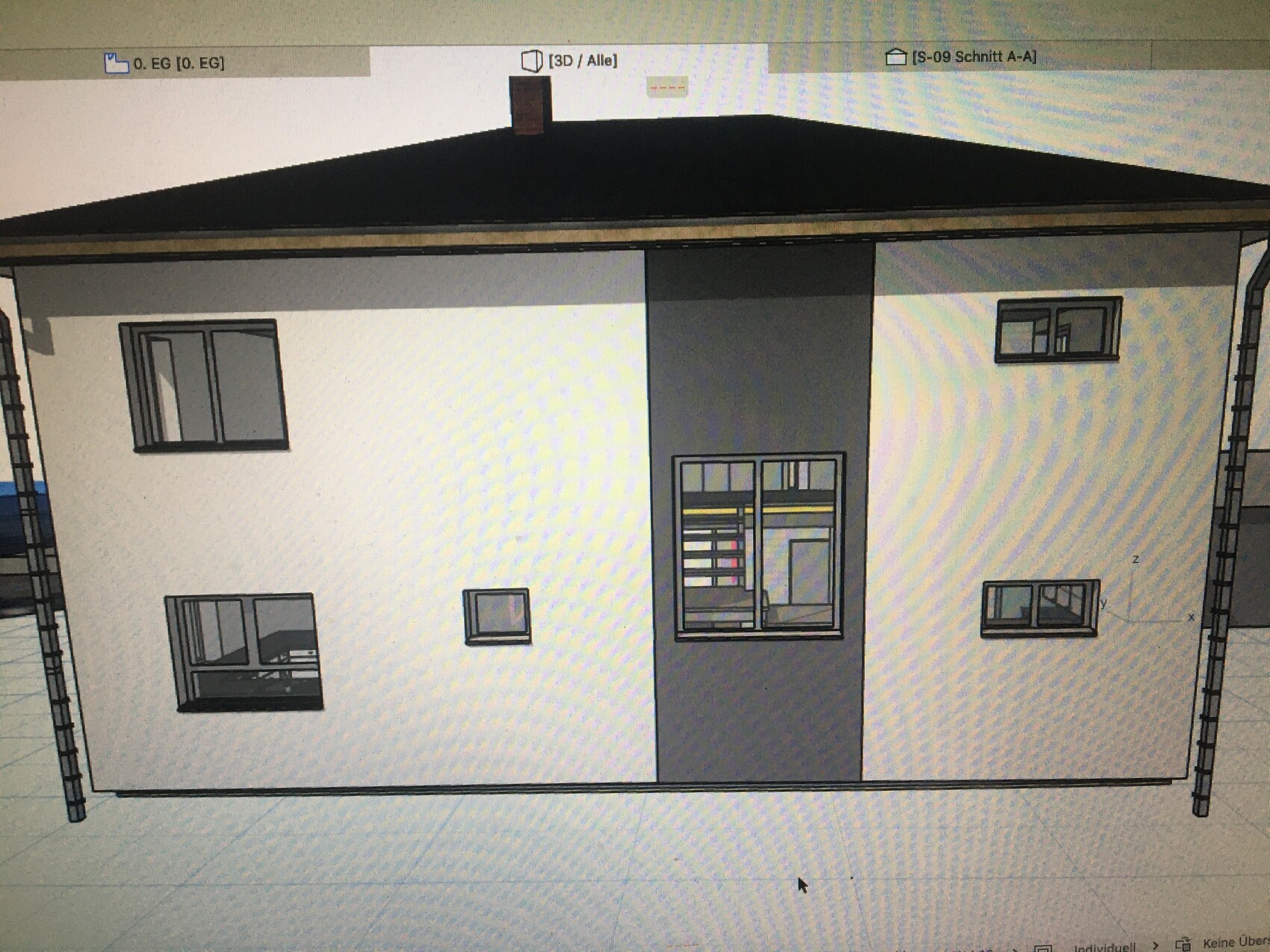 Kam mir auch schon der Gedanke, Treppenantritt gespiegelt. Und unter der Treppe den Hauswirtschaftsraum reinragten lassen, so dass in der Nische der Trockner und Waschmaschine Platz hätten (dann gingen sie nicht in ergonomische Höhe sondern auf den Boden). Optik würde das Treppenhaus „zugebaut“ aussehen.
