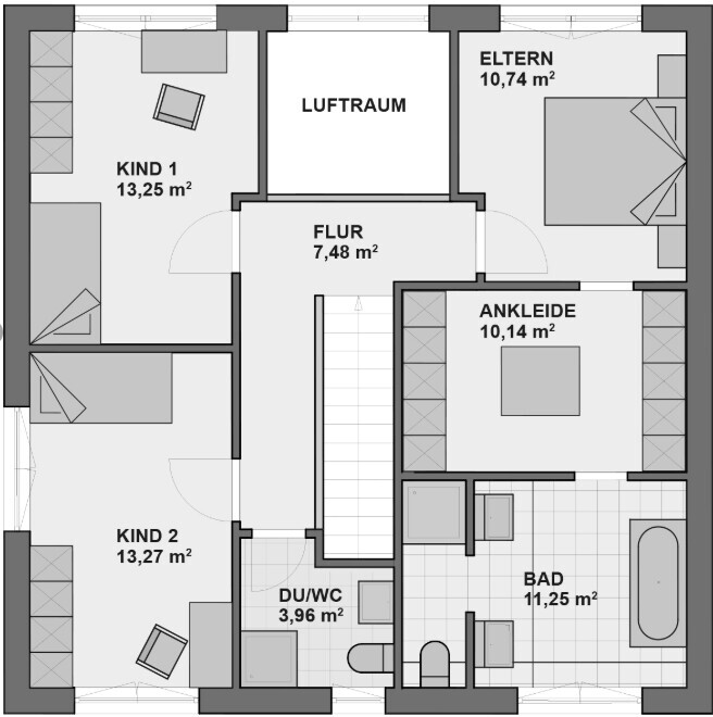 Übrigens der Luftraum oder das Kinderbad würden einen schönen Hauswirtschaftsraum auf der Schlafebene ergeben. Unser Architekt hatte mich damals gefragt ob ich gerne putze. Erst sind die Kinder zu klein, dann nutzen sie es etwas und dann sind sie weg und kommen nur ab und an.