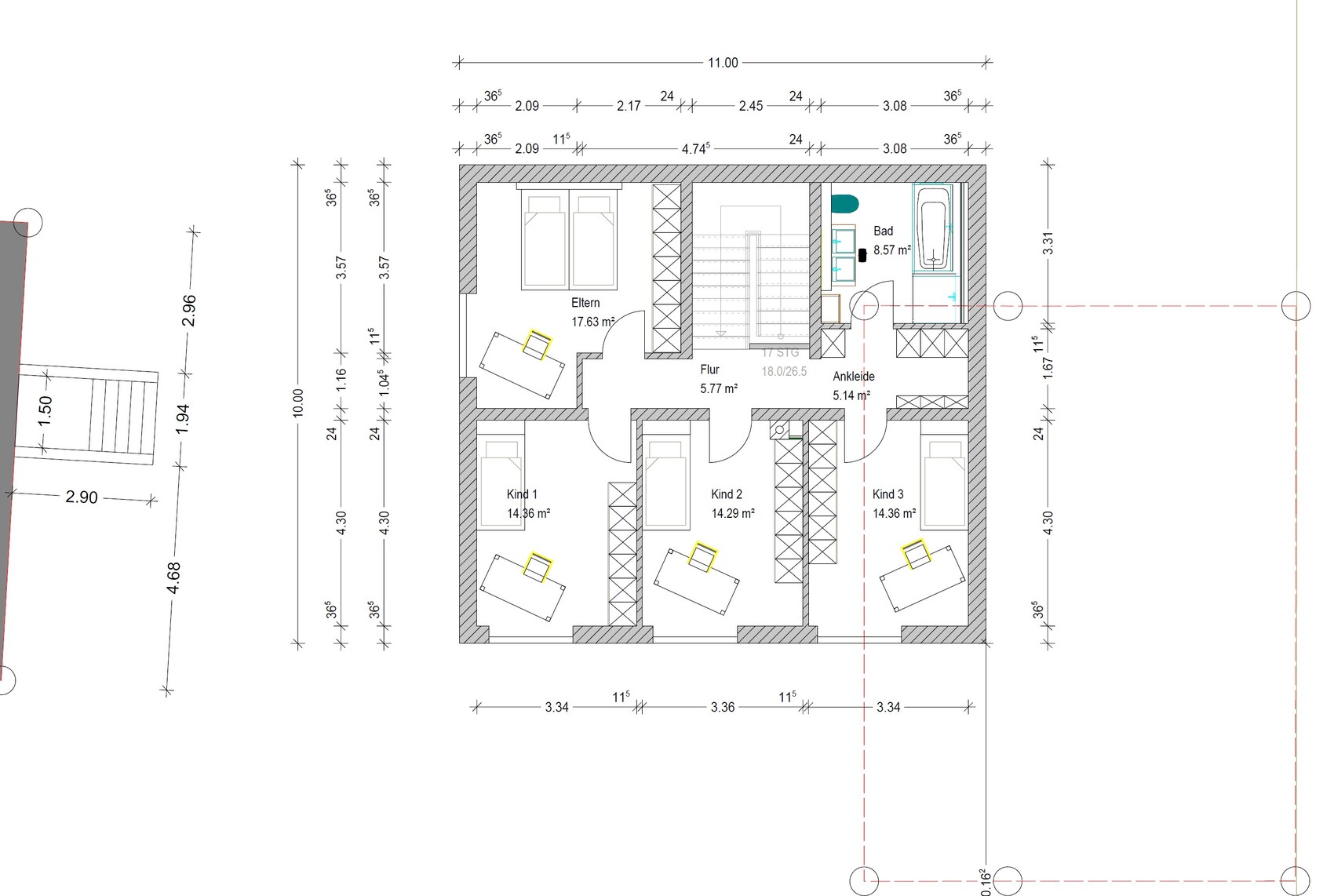 Wir haben ihm einen leicht angepassten Entwurf von "K a t j a" mitgegeben. In seinem Entwurf hat er wieder die Grundfläche erhöht, er hat das Home-Office einfach ins Elternschlafzimmer integriert, was in der Praxis absolut nicht funktioniert und die "Ankleide" vors zu kleine Bad gestellt. Wäscheschacht existiert auch keiner. Kinderzimmer sind unter der magischen Grenze, aber hätte ich durchgehen lassen, sofern der Rest gepasst hätte.