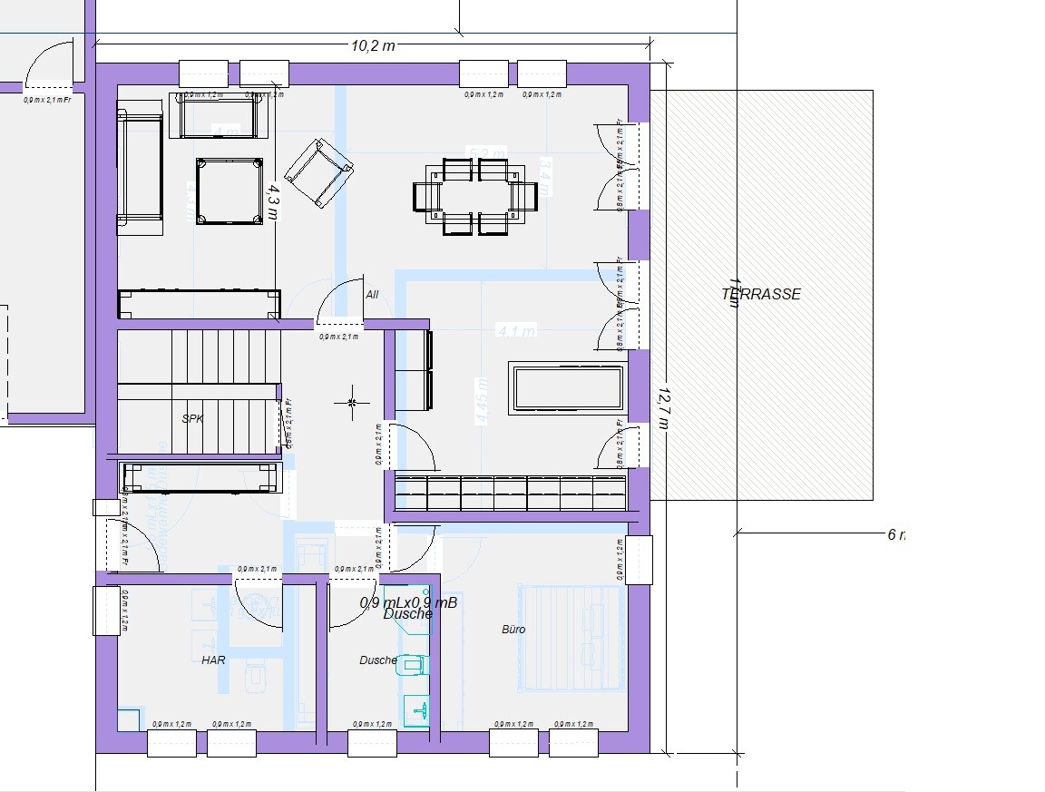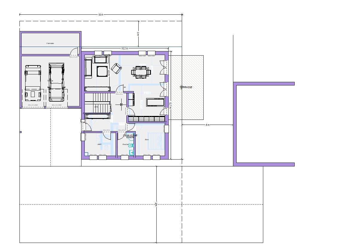 Grundriss eines Hauses mit Terrasse, Büro, HAR, Dusche, Treppenhaus und Möbeln.