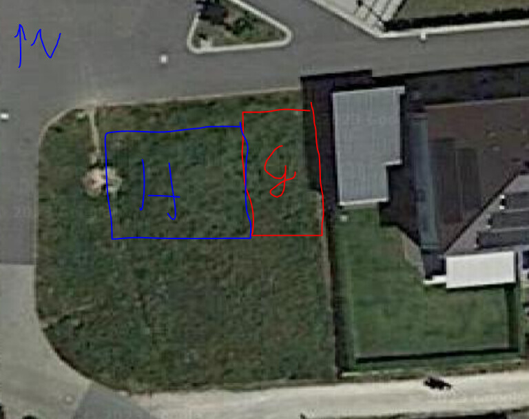 - Garage darf außerhalb des Baufensters z.Bb. in dem eingezeichneten roten Rechteck sein. Allerdings auch im Baufenster. Das Grundstück ist jetzt nicht winzig und der Nachbar hat dort schon eine Garage/Carport stehen. Somit würden wir die Garage gern dort dransetzen und nicht den Westen mit Aussicht auf Garagenrückwand verbauen.