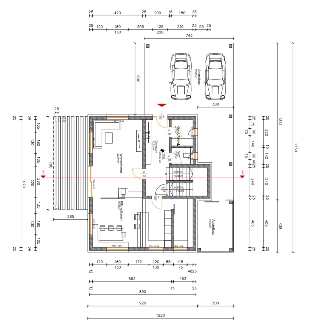 Mir gefällt es so besser, du hast einen tollen, großzügigen Küchen- und Essbereich! Bei 400 cm Küchenfront bekommst du halt 360 cm Standardschränke unter + Blenden oder + einen schmalen schrank. Für Symmetriefanatiker bei Küchenfronten ist des nix 😉 Das WZ ist mit 25 qm auch dicke groß genug.