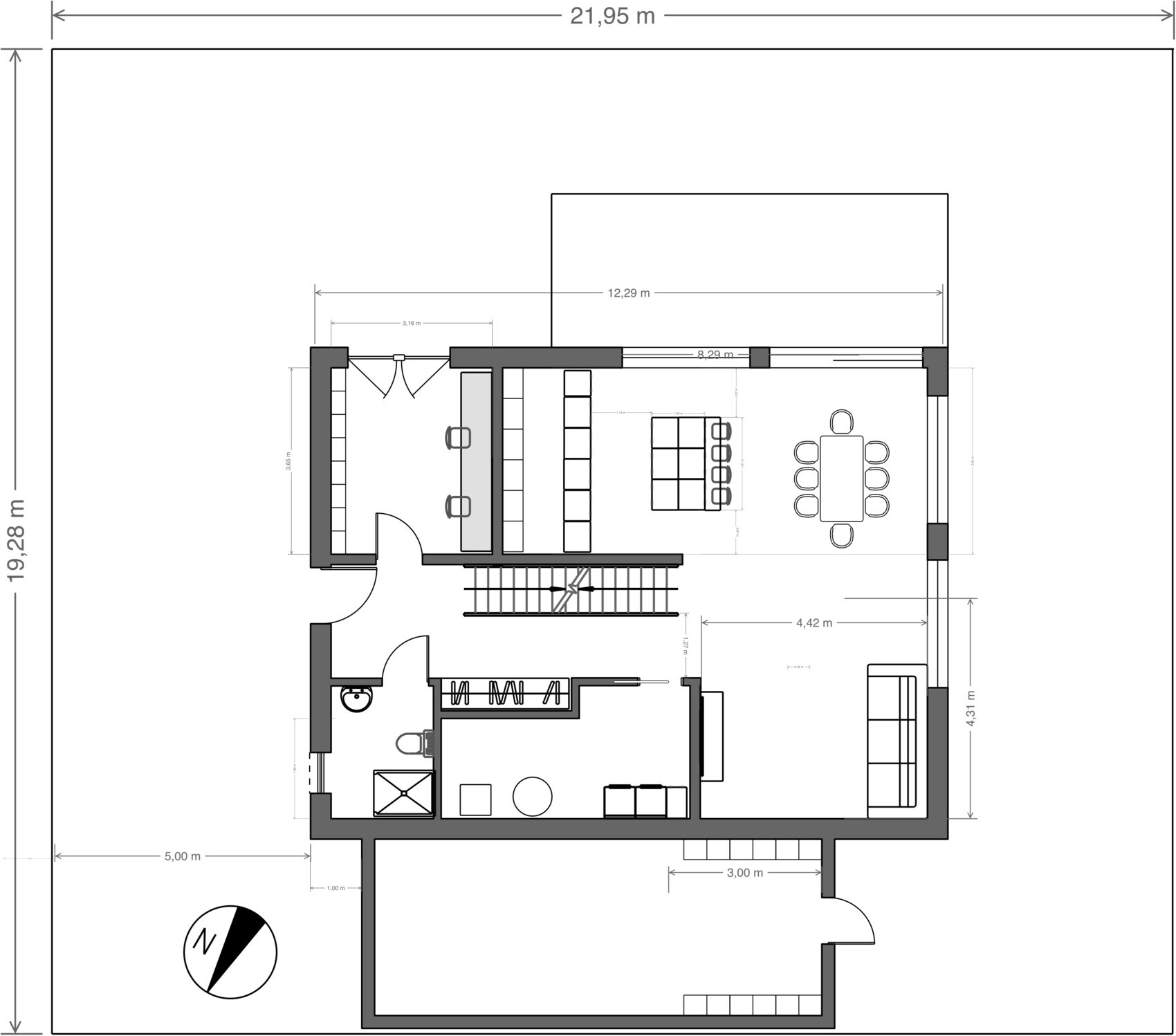 Die Treppe funktioniert so nicht. 5 Stufen überbaut? Wie hoch ist die Geschosshöhe?