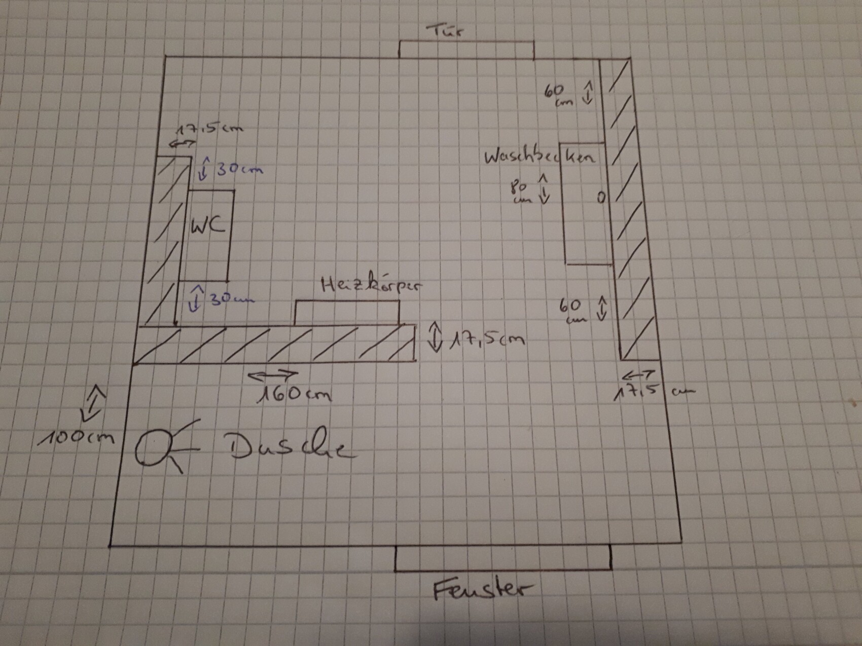 pffreestyler17.09.18 13:01Die Wanne ist der Möblierung zum Opfer gefallen. Wir haben unseren Schmutzwäscheeimer im Badezimmer und mit einer Badewanne wäre es eng, ungemütlich und zugestellt geworden, daher der Verzicht. Wir haben ja noch das OG. Der Eimer soll gegenüber der Dusche stehen (ist dort ein bisschen versteckter), daher den Heizkörper an die Duschwand. So zumindest unsere Überlegung.