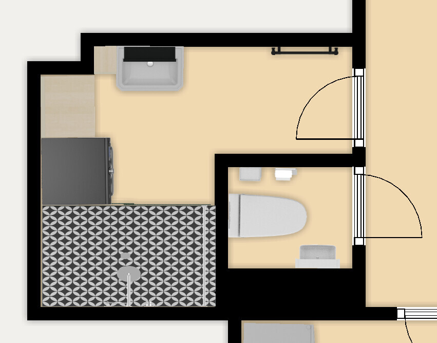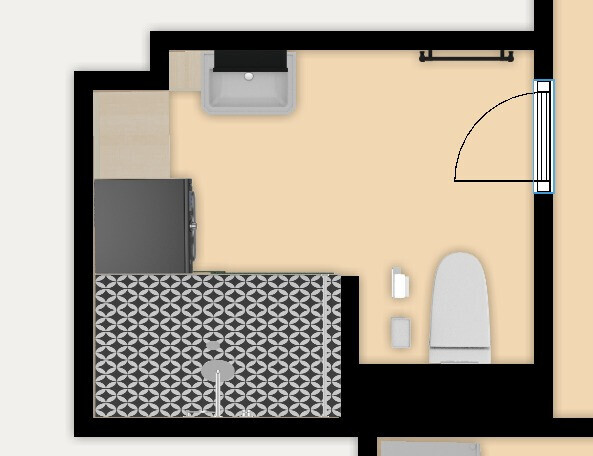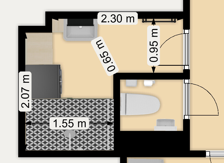 Mit geschlossene Toi halte ich alles für zu klein und zu eng. Du solltest mal breitere Türen einzeichnen, damit man die kleine Größe des Raumes fassen kann. 60er Flügel entspräche knapp eine Schranktür. So 78 sollte die Tür breit sein Und dann nicht in ein Stück WC-Flur führen, wovon der Raum nichts hat.