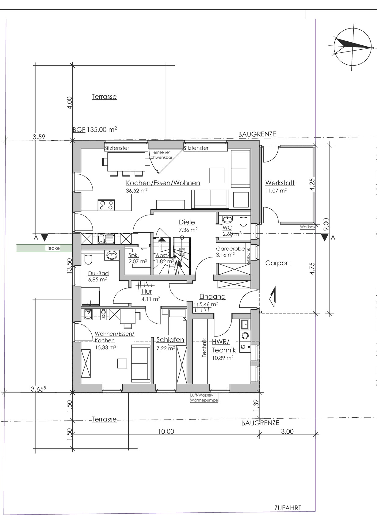 Ich würde aber eventuell so bauen, dass man später, wenn Papa doch in die Pflege geht oder nochmal seinen zweiten Frühling erlebt (wie alt ist denn Papa?), den Wohnbereich öffnen kann zur Einliegerwohnung. Insofern würde ich das Bad aus der Mitte des Hauses herausnehmen, auch Küche und Speis der Hauptwohnung mit dem Wohnbereich tauschen, damit man später das WZ erweitern kann. Vielleicht kann ich nachher mal eine Zeichnung machen (Bad Einliegerwohnung beim Hauswirtschaftsraum, davor zum Flur die Garderobe, WC wird zur Speis usf. (Ich schreibe das jetzt, ohne die Entwürfe vor mir liegen zu haben), kann mir dann aber für später mehr befriedigende Optionen vorstellen, als wenn man mit Technik in der Mitte des Hauses sich viel verbaut.