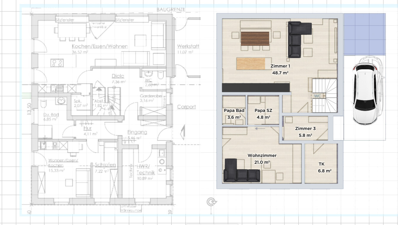 Also es ist ein Architekt ohne Anführungszeichen und ja, auch wir sind damit nicht zufrieden und haben das Gefühl von Anführungszeichen - es sind eben alle Räume drin, die wir wollen, aber irgendwie nur aneinandergereiht, was in großen Flurflächen o.Ä. resultiert. Das dann am Ende der Wohnzimmer-Teil des Allraums schmaler ist als der jetzige ist natürlich auch nicht das, was man sich von einem Neubau erträumt, vor allem nicht, wenn der Architekt in selbigem Wohnzimmer schon saß. Das z.B. die vordere Terrasse bis in die Buche hineingezeichnet ist, ist dann zwar eigentlich eine Kleinigkeit, aber sorgt eben auch für keine so gute Laune. Dass im Carport kein Auto stehen soll sondern vielleicht irgendwann mal eines geladen werden soll hatten wir aber auch so kommuniziert, DARAN würde ich also die Anführungszeichen keinesfalls festmachen.
