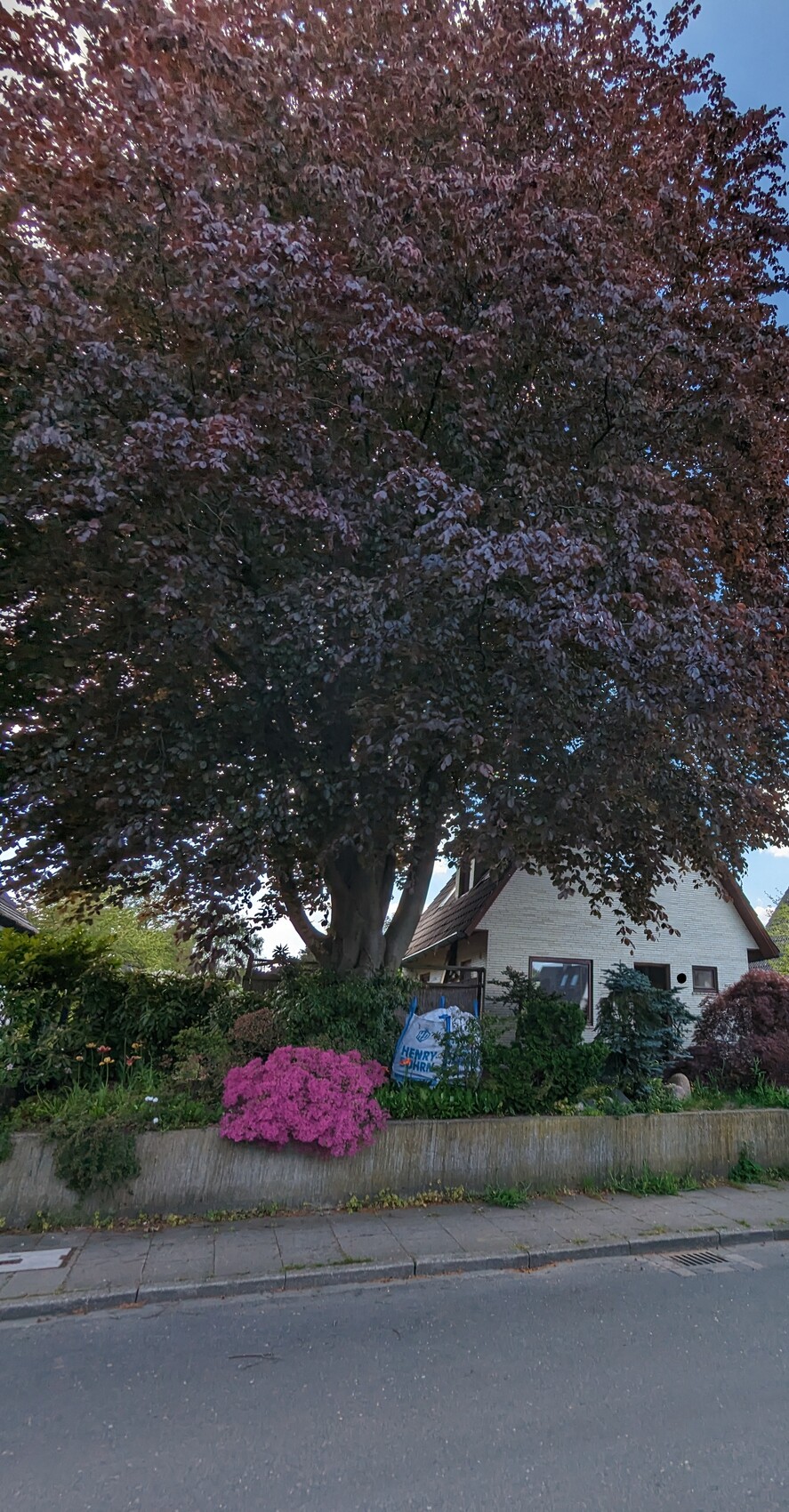 Die Buche ist aber auch der Hauptgrund für den Rücksprung: Ansonsten käme man der Krone sehr nah und müsste vor allem jährlich zurückschneiden, weil eben kaum Platz für den jährlichen Wuchs wäre. Gesagt hatten wir, dass dafür ein Erker (jedenfalls ein Vorsprung nicht über die ganze Hausbreite) ja ganz praktisch sein könnte. Daraus ist nun das mehr oder weniger "plumpe Abhacken des OG" geworden - was zusätzlich so nicht funktioniert, weil eben die Süd-Ost-Ecke zu nah am Stamm ist. Wir haben das gestern nochmal mit "unserem" Baumpfleger besprochen, der davon ausgeht dass es so nicht durchgehen würde oder die Baumpflege-Auflagen exorbitant aufwändig wären. Er würde uns dazu raten, die Bestandskellerwände (das Bestandshaus ist in der vorderen Hälfte unterkellert, allerdings sehr feucht und niedrig) der Ecke stehen zu lassen und dann auf der Südseite eigentlich nicht mehr als 11m zu bauen, den Arbeitsraum muss man beim Wurzelschutz auch beachten. Dafür könnte die Nordseite natürlich länger werden, was aber natürlich den Baukörper aufwändiger und damit tendenziell teurer macht. Ich habe mal ein Foto mit Blick von der Straße aus angehängt, um die Ausmaße der Buche zu verbildlichen.