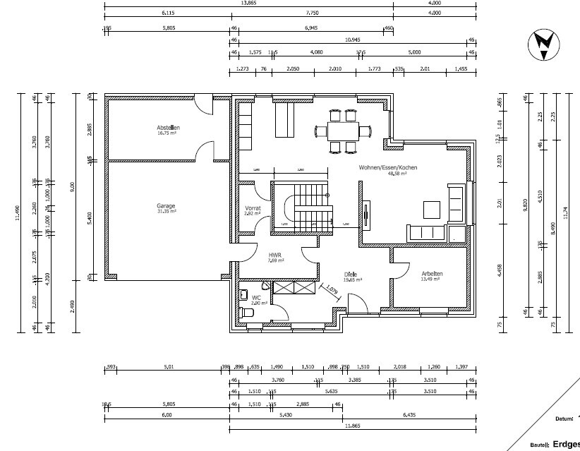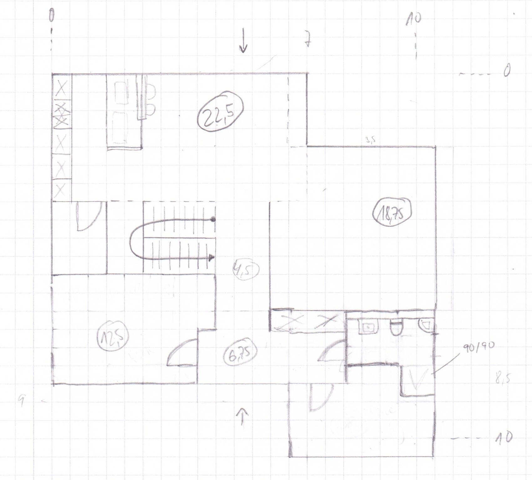 Der Pfeil unten markiert die Haustüre, im Eingangsbereich links befindet sich das Arbeitszimmer, welches später auch als Schlafzimmer genutzt werden könnte. Rechts geht es zum Gäste-WC und zum Hauswirtschaftsraum. Dadurch ist die Garderobe etwas versteckt. Die Treppe ist jetzt zur Küche und Essbereich hin offen, d.h. die Mauer wird in Höhe des Geländers liegen.
