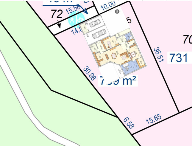 Die Garage ist so nicht zulässig, da Plan oben die 3m Baugrenze eingehalten werden müssen. Nur nach rechts zum Nachbargrundstück ist Grenzbebauung möglich.