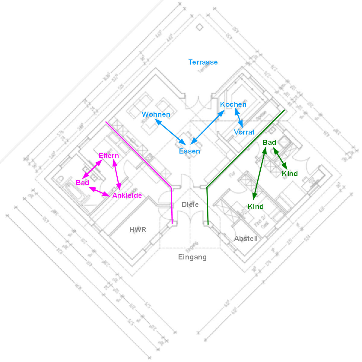 Hier stehe ich komplett auf dem Schlauch was ihr meintSo sollte man den Fächer und die Segmente erkennen können. Die Raumnamen habe ich mal farbig gruppiert und mit Beziehungspfeilen versehen. Zum "Wiedererkennen" habe ich den Konkretgrundriss unterlegt, den müßte man sich zum Weiterentwickeln des Abstraktgrundrisses dann wegdenken.