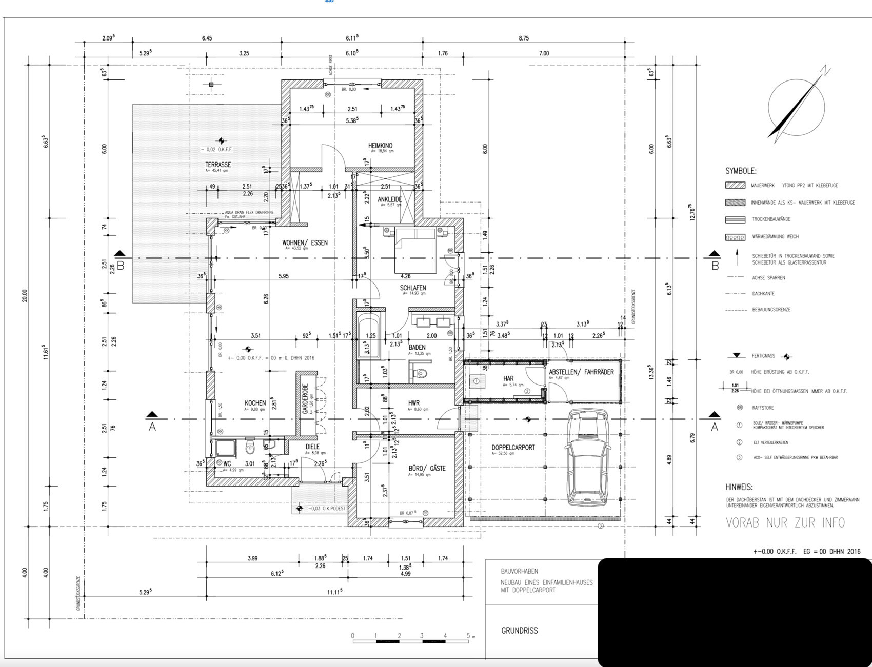 Von unserem Wunsch-Kamin haben wir uns verabschiedet. Der Kaminsacht ist auf dem Plan nicht eingezeichnet. Er liegt im Wohn/Essbereich an der Innenwand zum Schlafzimmer. Ungefähr 1 m über des Schnitt B.