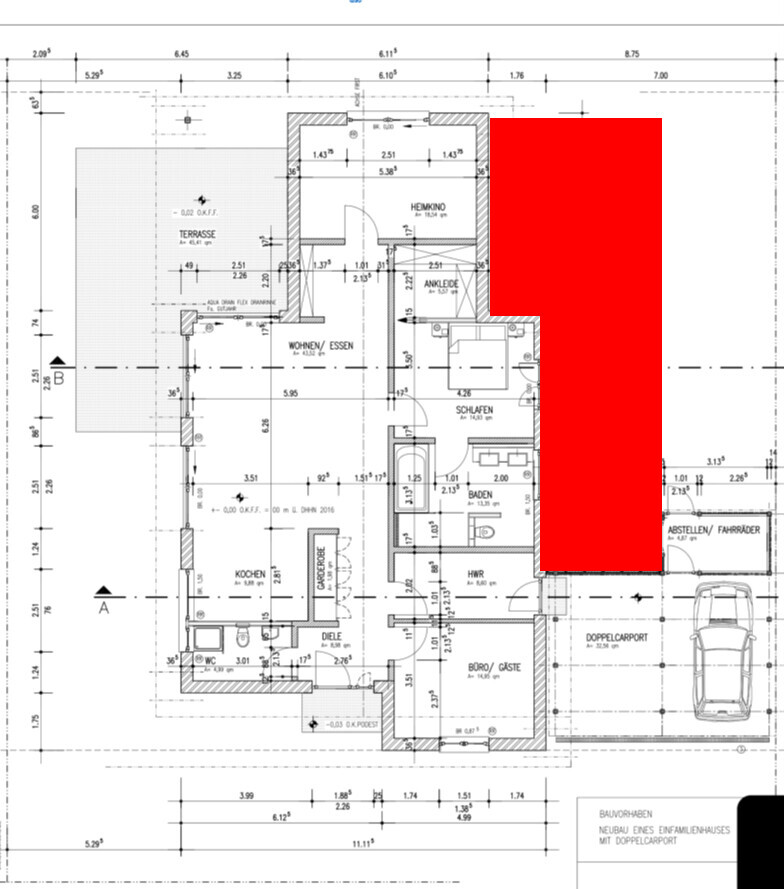 Gefällt mir von der Aufteilung und Platzierung auf dem Grundstück leider gar nicht. Der rot gekennzeichnete Bereich ist verschenkt, da könntest Du das Haus platzieren und dementsprechend auf der Süd-West-Seite vom Nachbarn abrücken und müsstest mit der Terrasse nicht so dran kleben. Bei Dir hat das Heimkino den schönsten Platz auf dem Grundstück. Hier wäre ein WZ oder Küche-Esszimmer mit großem Süd-Westfenster doch viel besser aufgehoben. Feng Shui Kundige werden die Hände über dem Kopf zusammenschlagen. Wohnzimmer = Durchgangszimmer, Schlafzimmer = Durchgangszimmer mit 3 Türen. Aber zeichne doch mal die Möbel in Küche und Wohnen/Essen ein, damit wir wissen wie du dir das vorstellst.