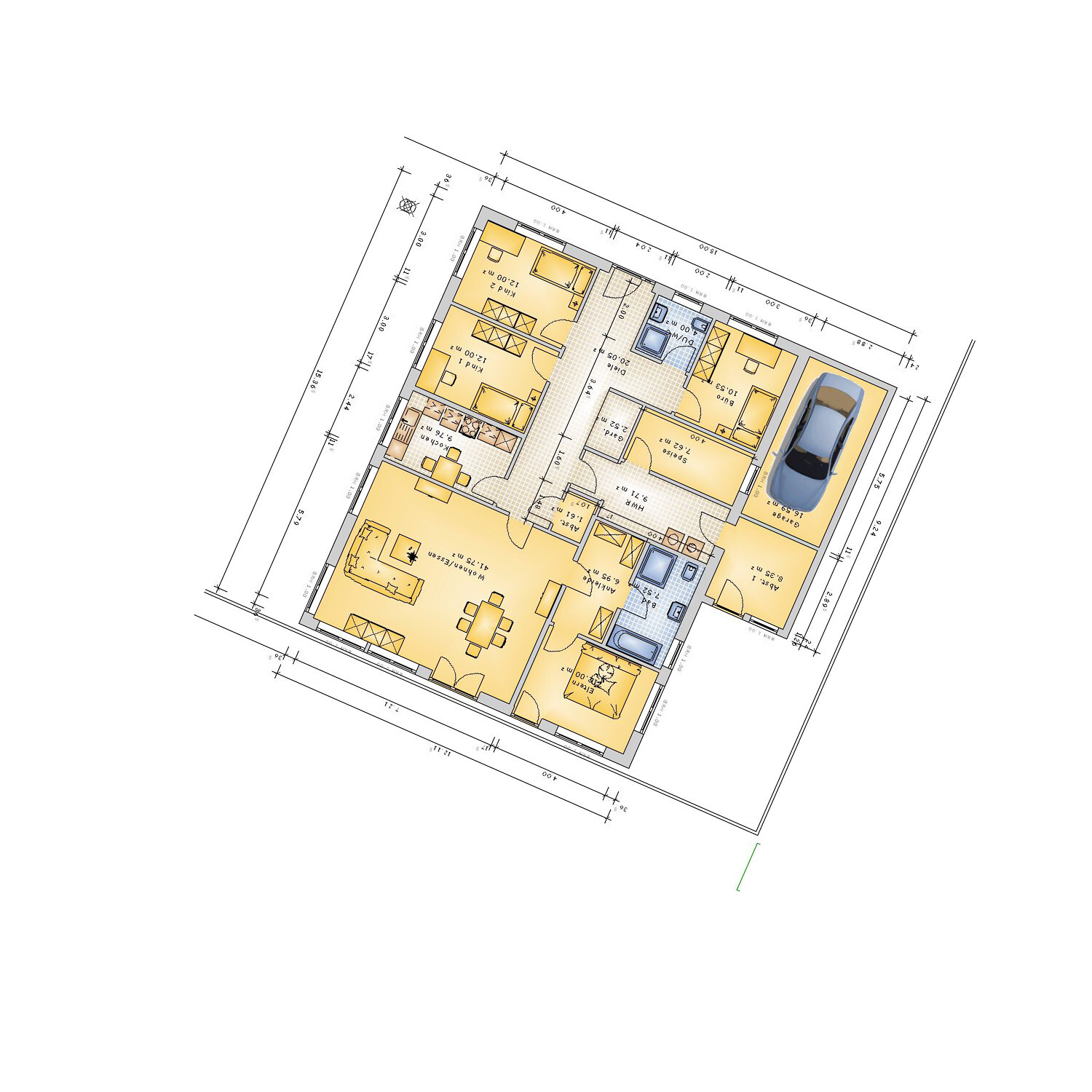 Würde Küche und Schlafen von der Ausrichtung tauschen. Terrasse zum Grünstreifen, blickgeschützt durch die Garage.