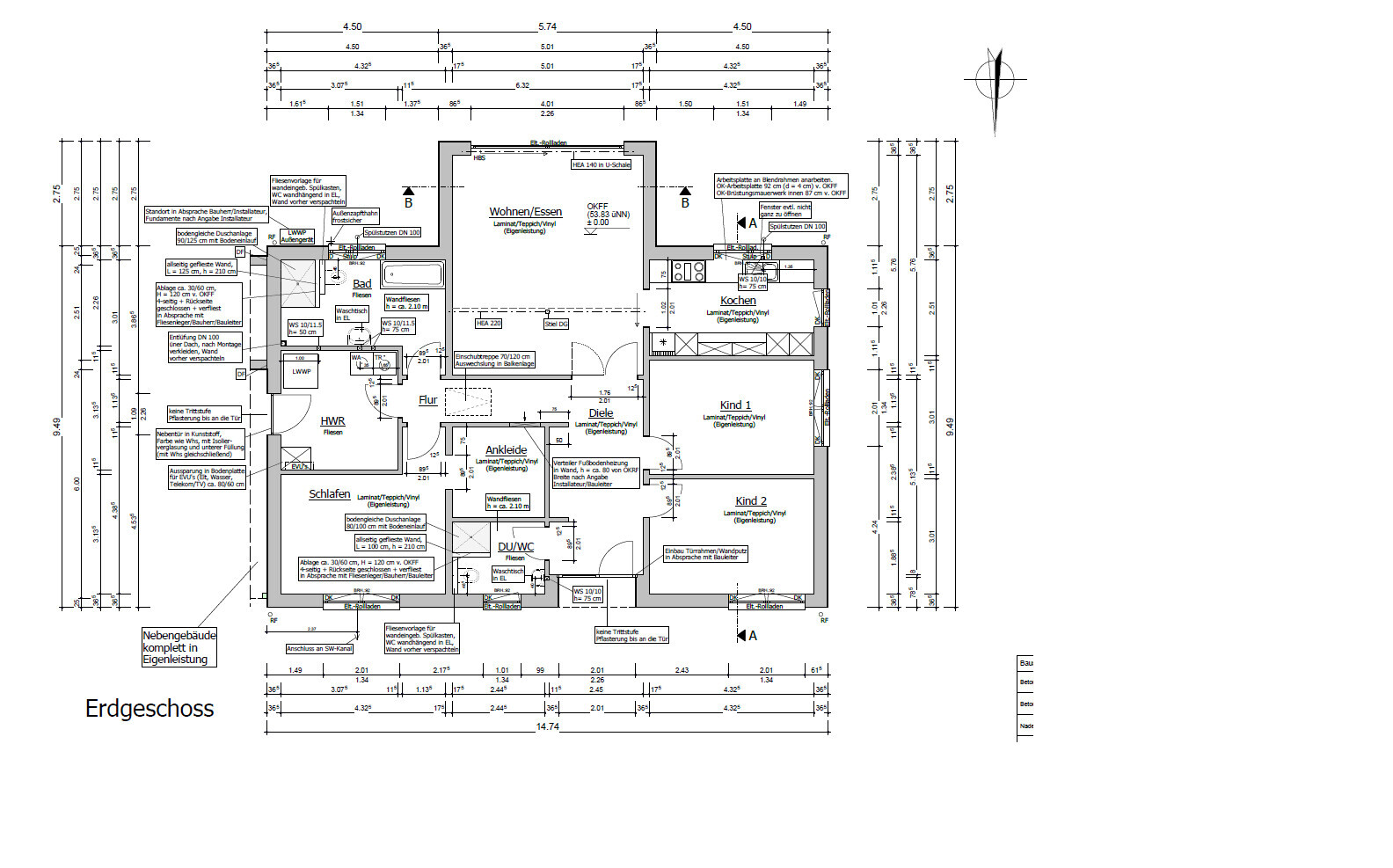 Bad wird um 70 cm verkleinert damit der Hauswirtschaftsraum um diese Maße vergrößert wird.