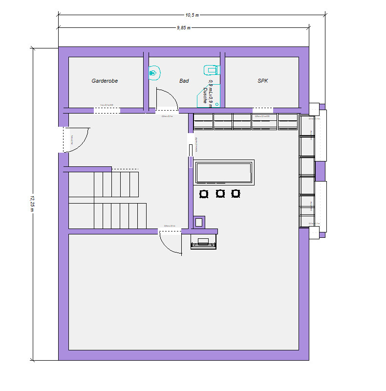 Eigentlich war unsere Idee eine Speisekammer durch die Küchenfront begehen zu können(ja ich weiß, neumodischer Schnickschnack) und diese dann im Norden der Küche anzusiedeln, das würde aber die Lichtachse in dem Bereich verhindern und die Fenster im Norden an der Seite unnütz machen.