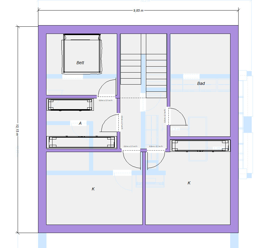 (Mein Programm ist schon sehr alt und kann nicht alles perfekt darstellen. Für den nötigen Chic muss der Architekt sorgen - mir geht es nur um die Aufteilung.)