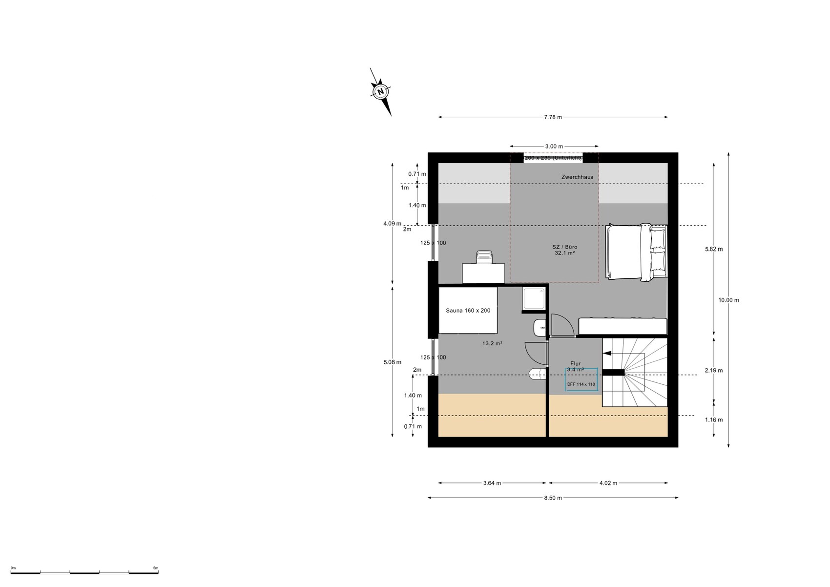 - Schlafzimmer und Büro ist zu einem großen Raum geworden. Hintergrund ist, wir möchten das Zwerchhaus in der Mitte platziert ist. Ich finde, dass sieht sonst sehr komisch von Außen aus. Zunächst haben wir die Räume mittels Wand in der Mitte des Zwerchhaus getrennt. Auf der linken Seite das Büro, auf der rechten das Schlafzimmer. Das Schlafzimmer sah aber komisch aus weil es nur im linken Eck ein Fenster (des Zwerchhaus) hatte. Ein Dachfenster im Schlafzimmer möchten wir nicht haben, da man sonst bei Regen nicht schlafen kann. Daher die Aufteilung zu einem großen Raum was uns eigentlich auch ganz gut zusagt. Man kann hier schön nach der Sauna entspannen. Generell gibt es in unserem Fall kein Problem das Büro im Schlafzimmer zu haben, ist aktuell auch so und bereit keine Probleme. Bin aber natürlich offen für Ideen wie man die Räume einzeln aufstellen kann.