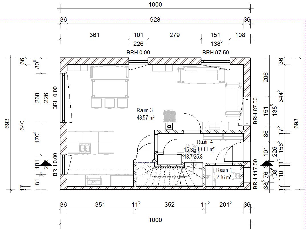 Die Treppe funktioniert so meines Erachtens überhaupt nicht. Jedes Mal, wenn man hoch und runter will, muß man die WZ-Türe schließen bzw. bekommt sie beim runtergehen schlimmstenfalls vor den Kopf, weil gerade jemand reingestürmt kommt.Ja, nach den Zeichnungen ist mir das auch aufgefallen. Der Hintergrund war, dass ich eigentlich gerne den Kellerabgang im Flur noch gehabt hätte und diesen auch mit nur Tür noch versehen. Jetzt sind wir wieder bei der offenen Variante, dass das Treppenhaus komplett im Wohnbereich und alles offen ist.