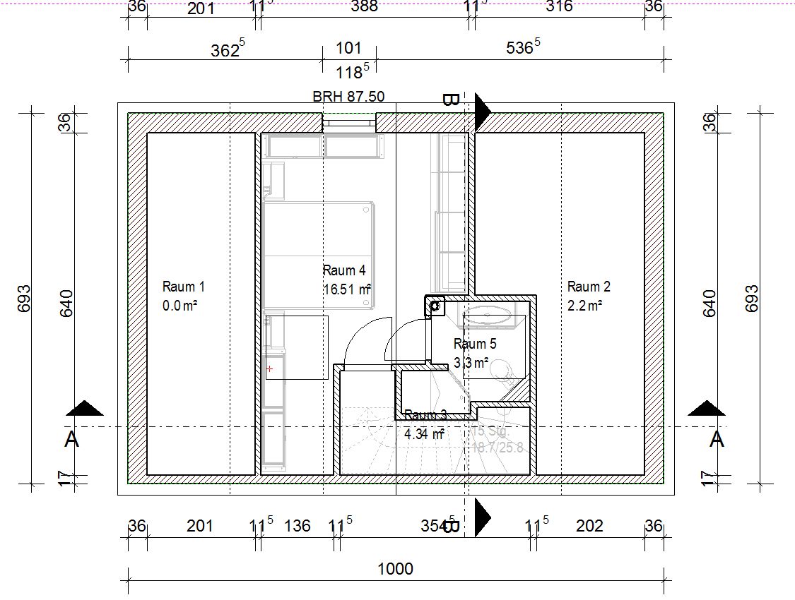 - Im DG Wände bei Kniestockhöhe gut 130 cm gezogen, denn, wie man im Schnitt ganz gut erkennen kann, hat man dann eine Chance auch bei halbwegs angenehmer Höhe aus dem Bett zu kommen. Im Ursprungsplan verlief die 2m-Linie ja fast schon am Fußende des Bettes: