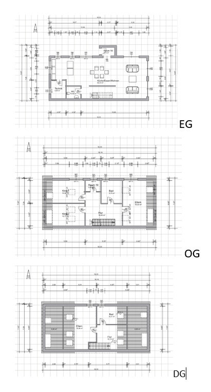 Drei Grundrisse eines Hauses: EG, OG und DG.