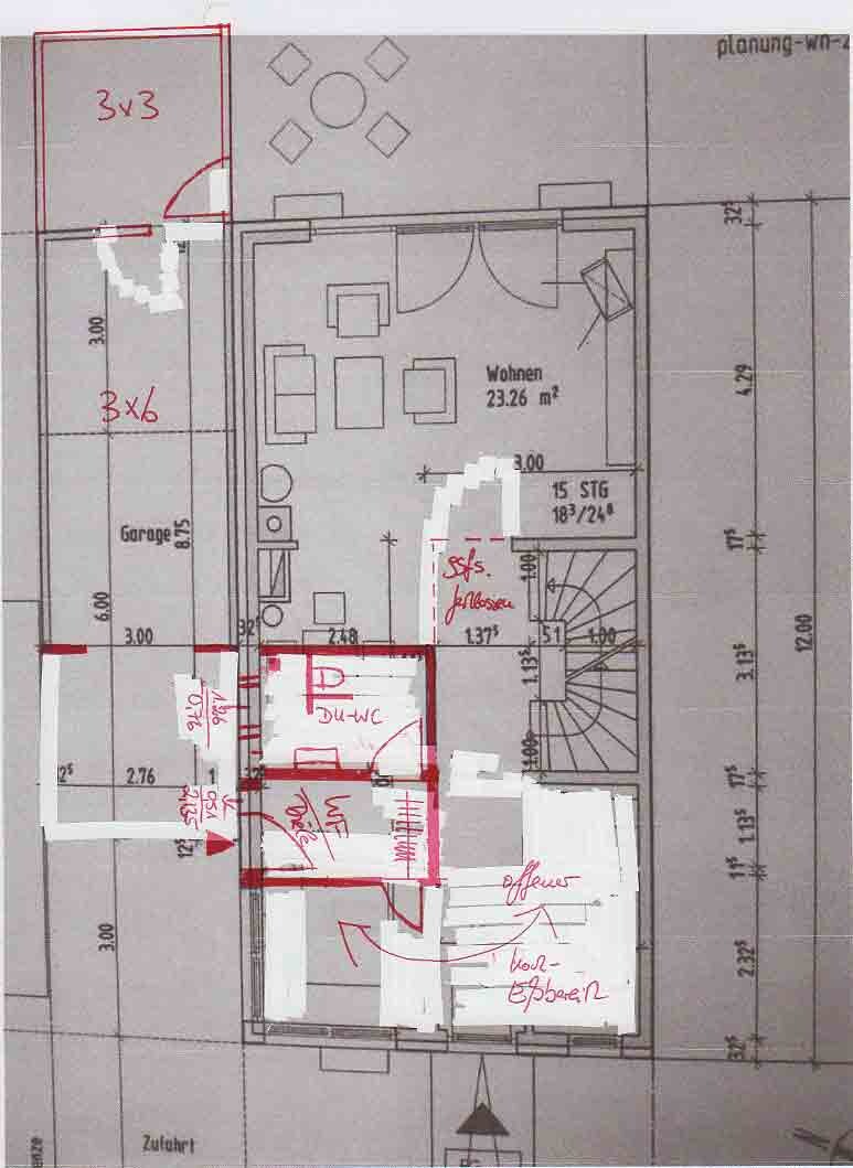 Ich habe - auf die Schnelle - den EG-Grundriss verändert. Es eröffnet sich ein ganz anderes Bild, wenn Du die Garage um 3,00 m nach hinten versetzt; machen die meisten Bauämter mit und wenn nicht, würde ich an Deiner Stelle überlegen, auf eine normale Garage 3,00 x 6,00 m zu wechseln; Du hast einen Keller geplant. Dadurch kannst Du den Zugang zu Deiner Doppelhaushälfte auf die linke Seite legen und voilàá Kegelbahn ade. Nun hast Du den Freiraum zu überlegen, ob Du eine Garderobe möchtest oder doch lieber einen weiteren Zugang geradeaus ... ob Du einen offenen Koch-/Essbereich möchtest oder lieber nicht ... ob Du einen amerikanischen Zugang (Eingang direkt im Verbund mit der Lebenssituation ohne Diele) haben oder klassisch bleiben möchtest ... ob Du die Treppe als planerisches Teil im Wohnbereich haben möchtest oder doch eher abtrennst ... wie angehängt, liegen wenigstens die Anschlüsse der Bäder übereinander ... usw. Ggfs. kannst Du das Treppenauge noch bis zur 2,00 m-Linie vorziehen, damit ergeben sich andere Möglichkeiten der Raumaufteilung in OG und Spitzboden.