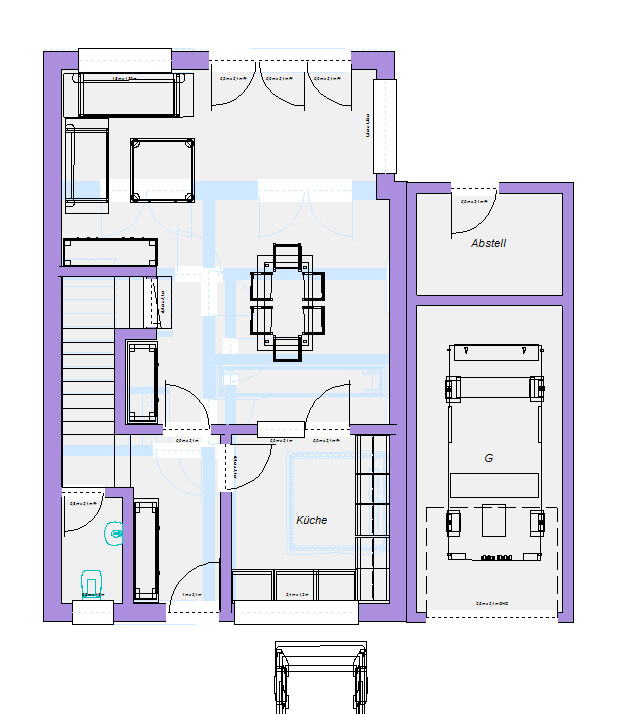 Kleines Achtung: Im Gäste-WC müsste der Fußboden angehoben werden - leider um 2 Stufen, womit die Deckenhöhe etwas mau wird. Zugang vom Flur wäre natürlich auch möglich, aber da verliert man wichtige Stellfläche für die Garderobe. Ich würde auch ungern die Küche als Stellwand nehmen, da man dann die Laufwege zerstört. Aber vermutlich läuft es darauf hinaus.