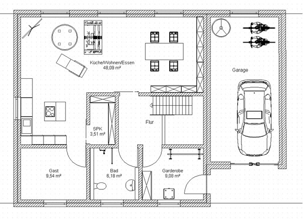 2D Grundriss eines Hauses mit Küche, Wohnen, Essen, Bad, Garderobe und Garage