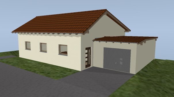 3D-Modell eines zweistöckigen Hauses, linke graue Fassade, rechte weiße Wand, Solarpanel-Satteldach.